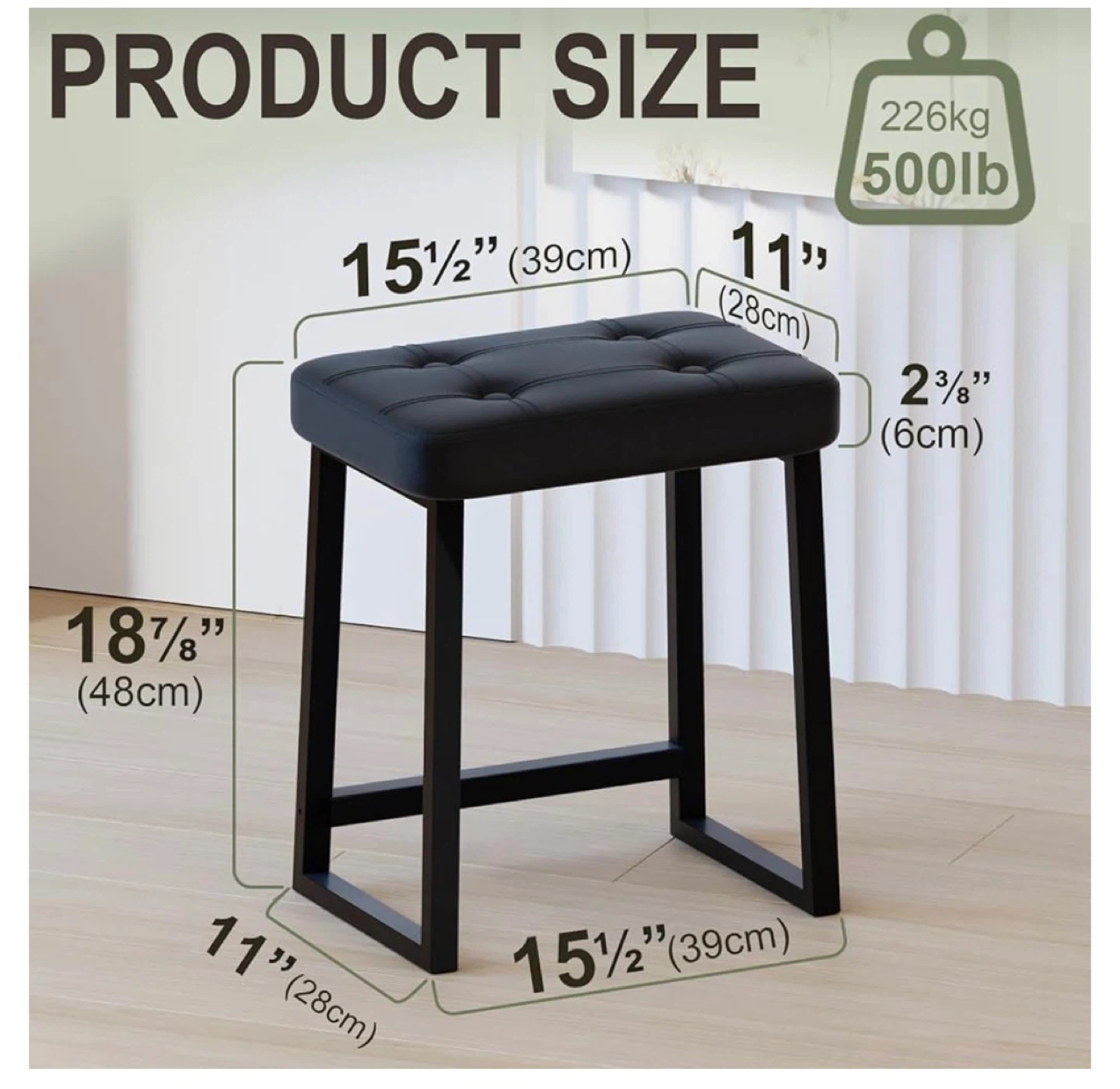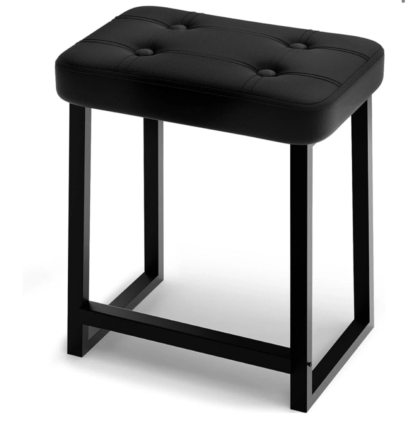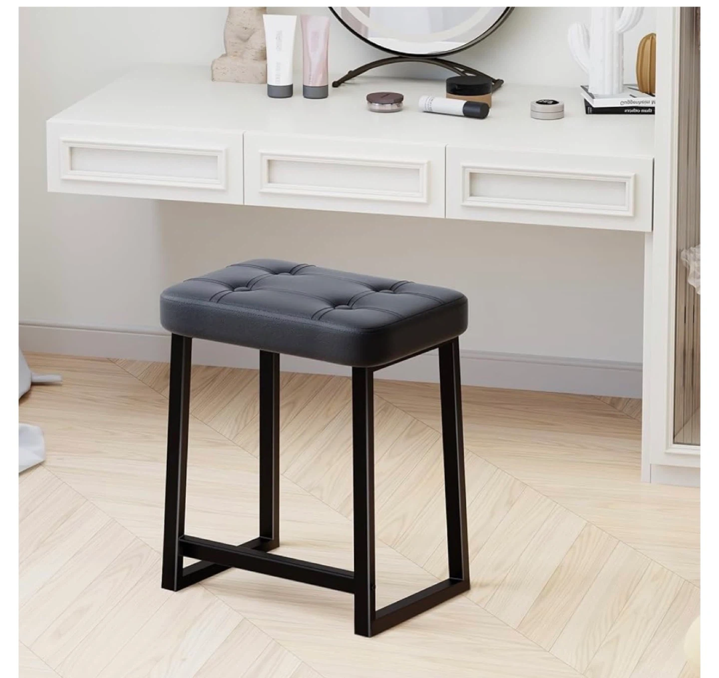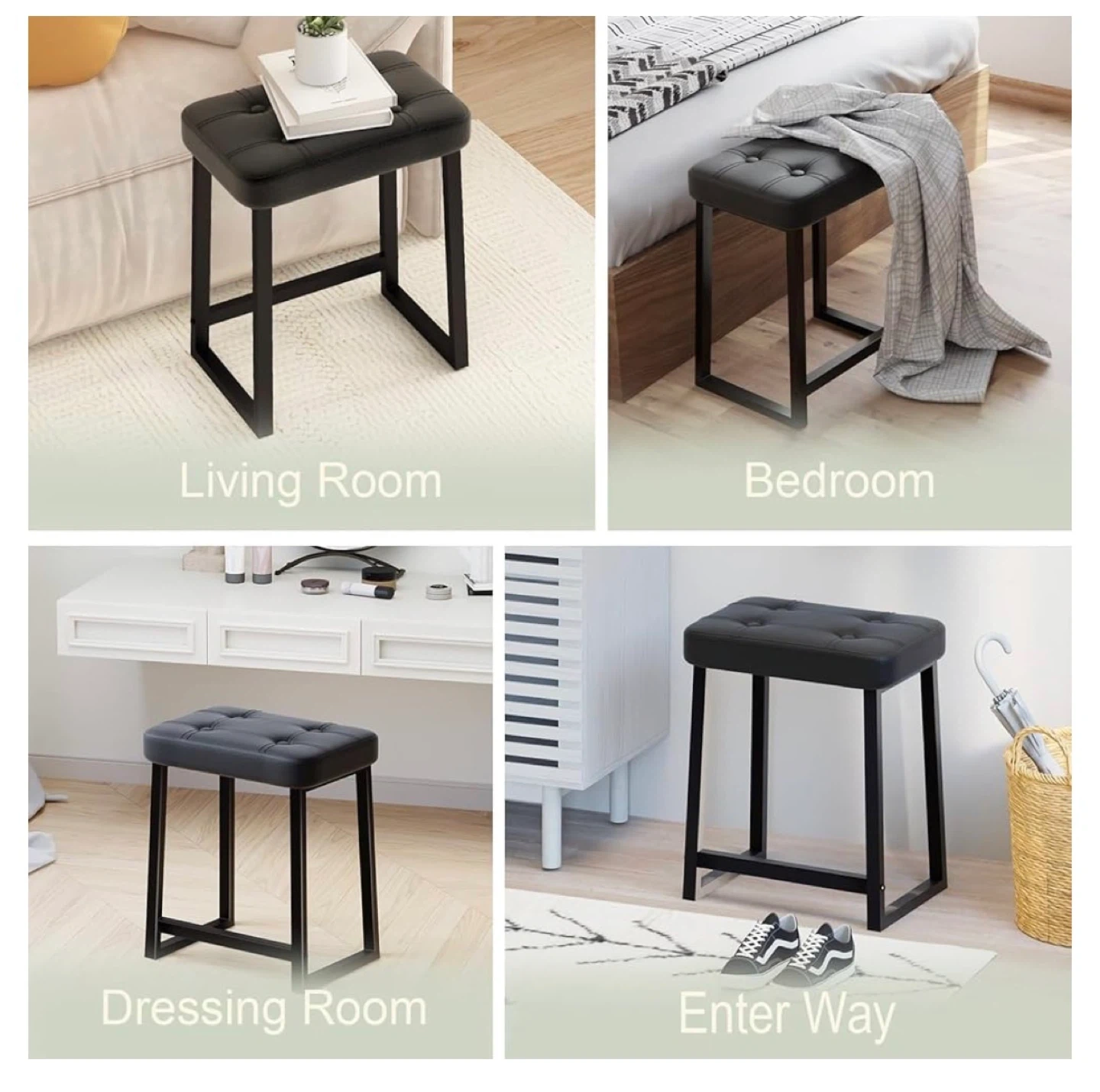 This black vanity stool features a tufted upholstered seat with a metal frame. It's 18 7/8 inches tall and has a weight capacity of 500 lbs. This stool is perfect for a dressing room or bedroom.
