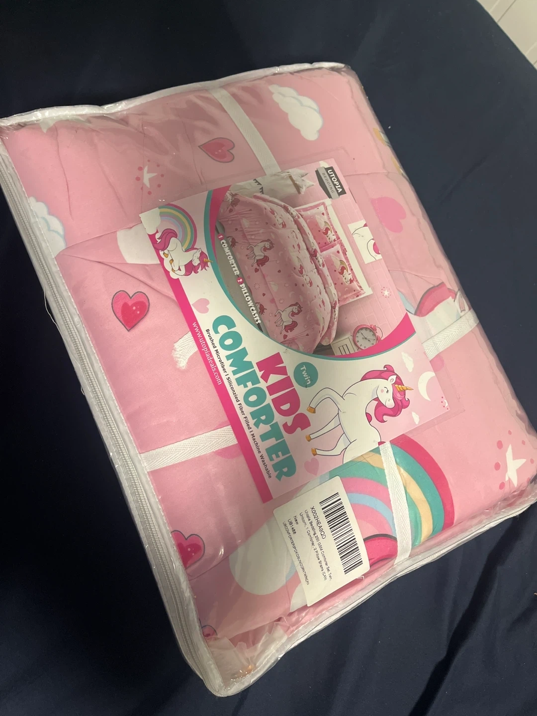 I'm selling a brand new Utopia Kids Comforter Set in Twin size! It comes with one comforter and two pillowcases, all featuring a cute unicorn design.