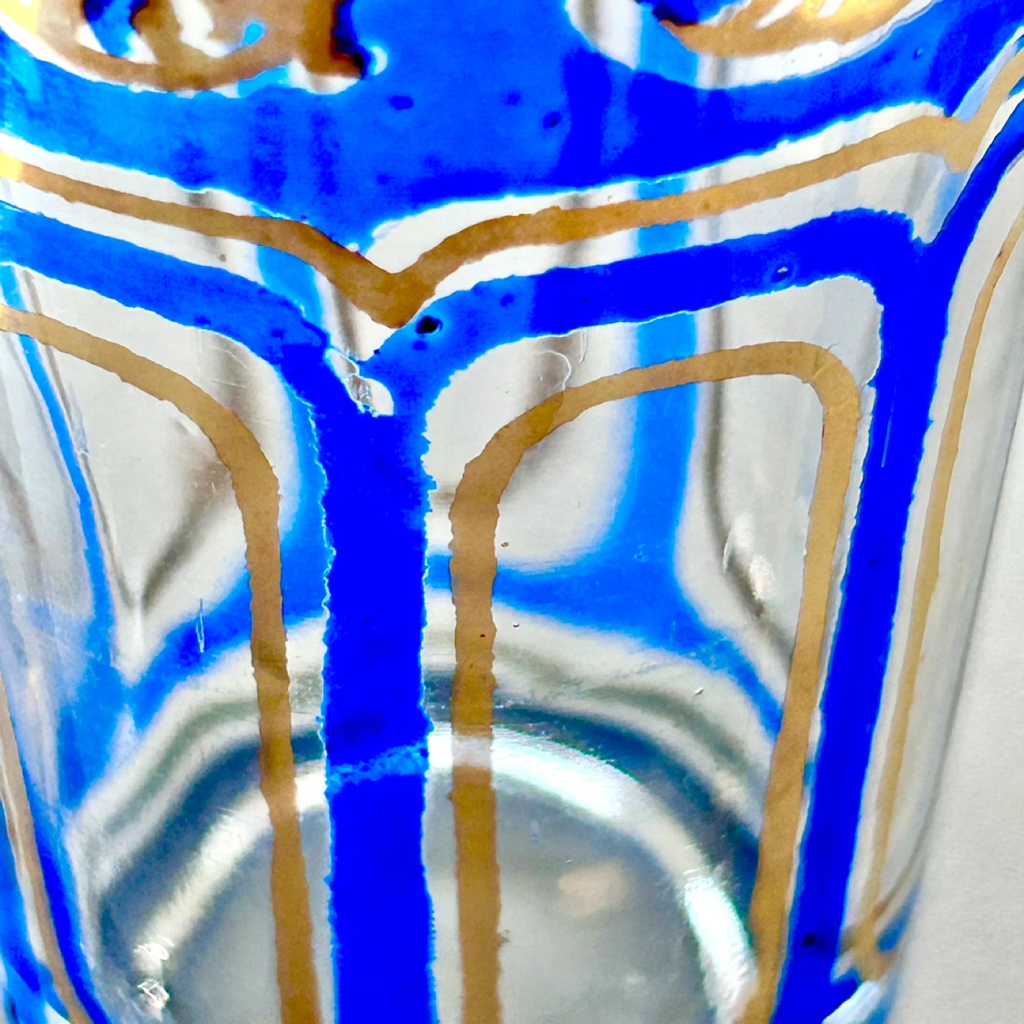 Bohemian glass, cobalt blue glass, gilt glass, gold enamel glass, aperitif glasses, vintage tumblers, European glass, mid century glass, Moser style, luxury glassware, cordial glasses, hand painted glass, collectible glassware, blue and gold glass, Austrian glass style, Bohemian crystal style, vintage barware, art glass set, FirstDibs style, maximalist decor