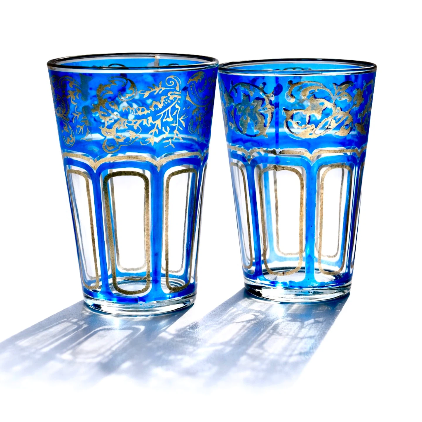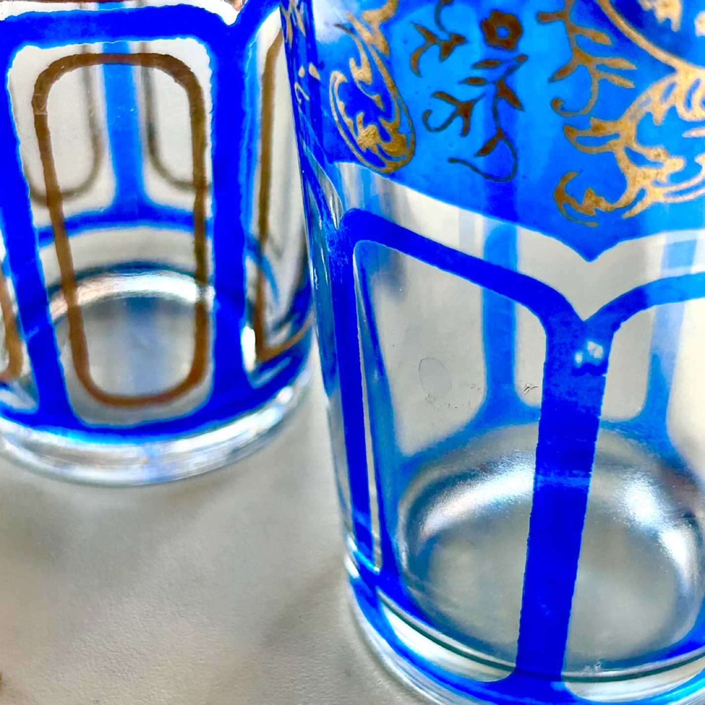Bohemian glass, cobalt blue glass, gilt glass, gold enamel glass, aperitif glasses, vintage tumblers, European glass, mid century glass, Moser style, luxury glassware, cordial glasses, hand painted glass, collectible glassware, blue and gold glass, Austrian glass style, Bohemian crystal style, vintage barware, art glass set, FirstDibs style, maximalist decor