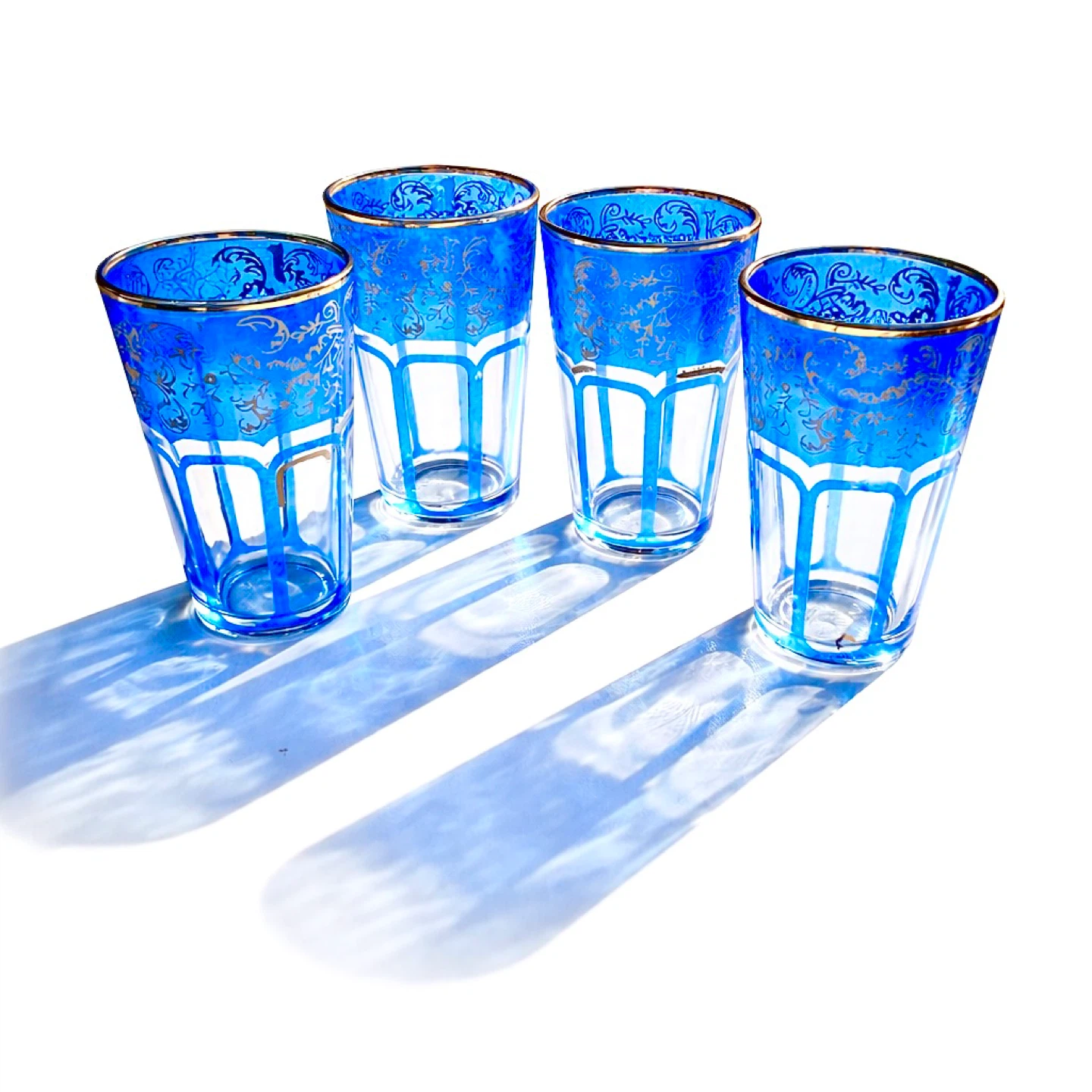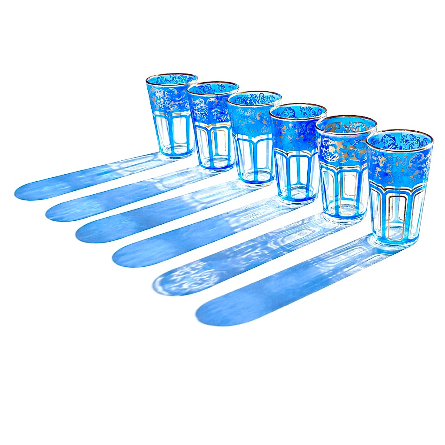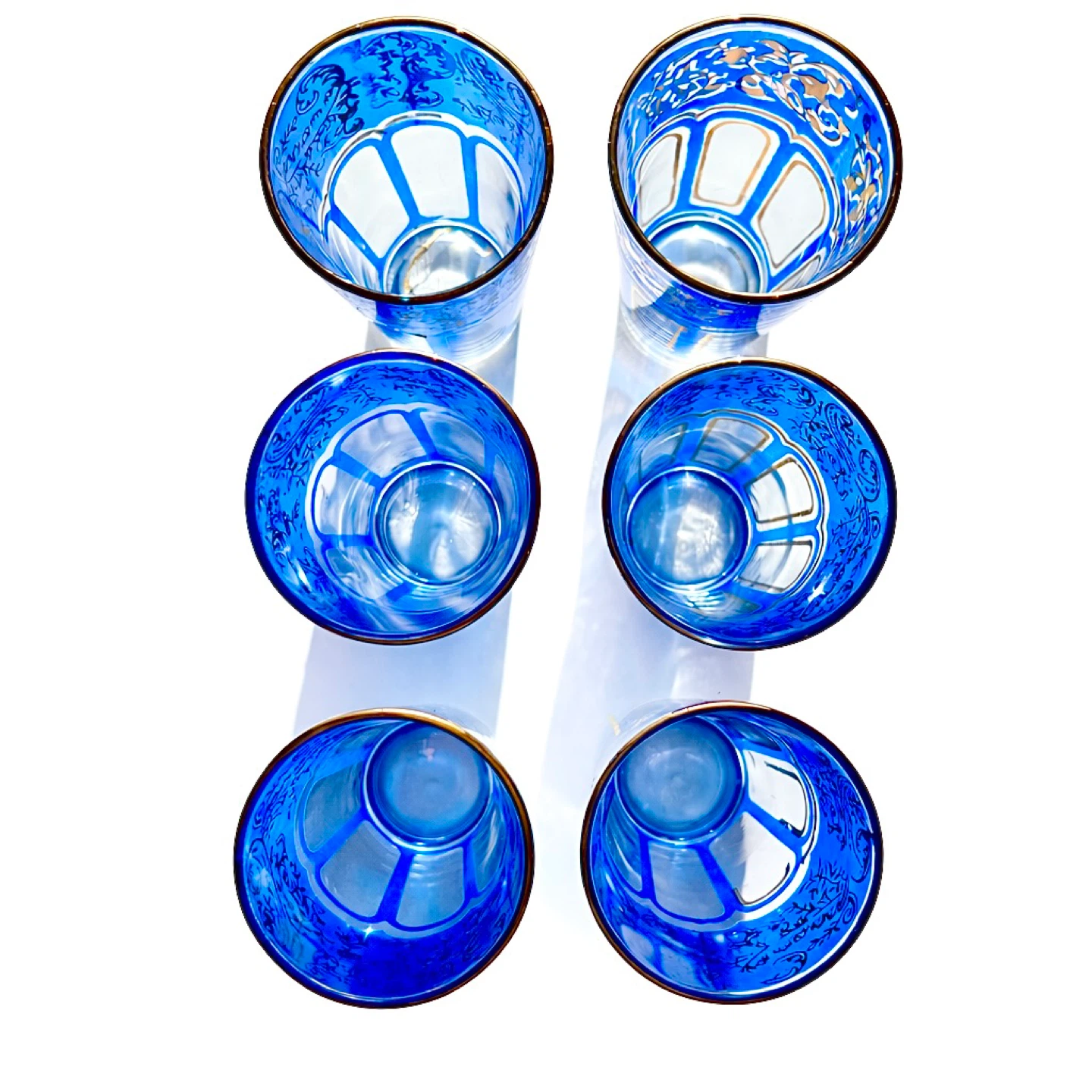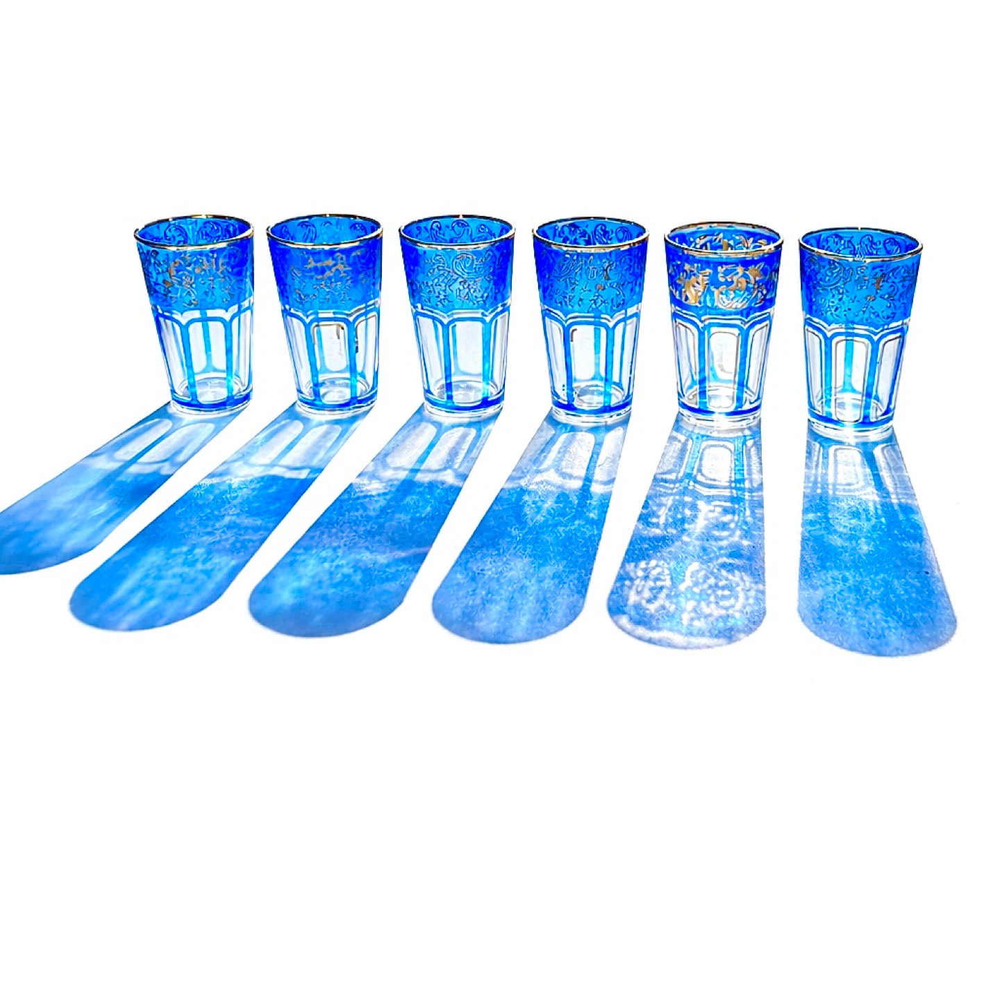 An exceptional set of six cobalt blue and gilt glass aperitif tumblers, produced in the Bohemian tradition and dating confidently to the late 1950s–1960s. These are substantial, well-balanced drinking glasses—larger than shot glasses—intended for aperitifs, cordials, vermouth, or refined small pours.