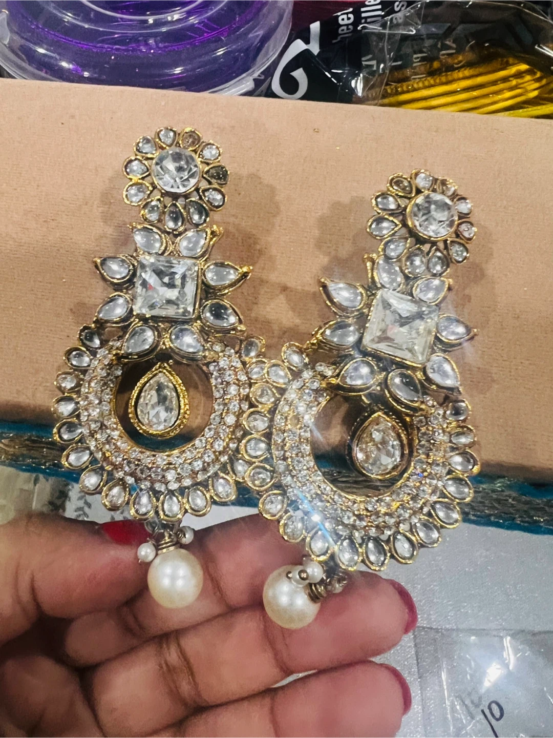 Sparkling gold tone earrings with clear crystals and pearl drops. These statement earrings have a intricate floral design. Perfect for adding a touch of glam to any outfit!