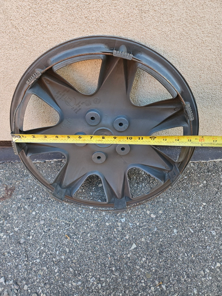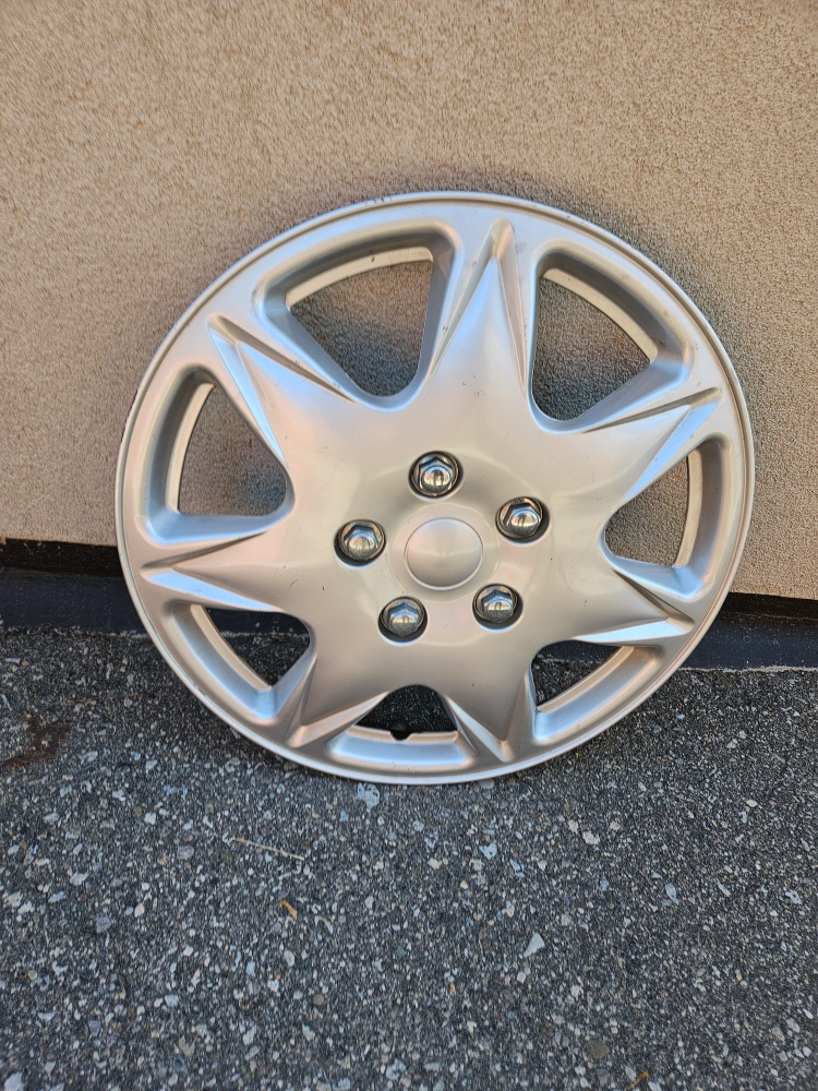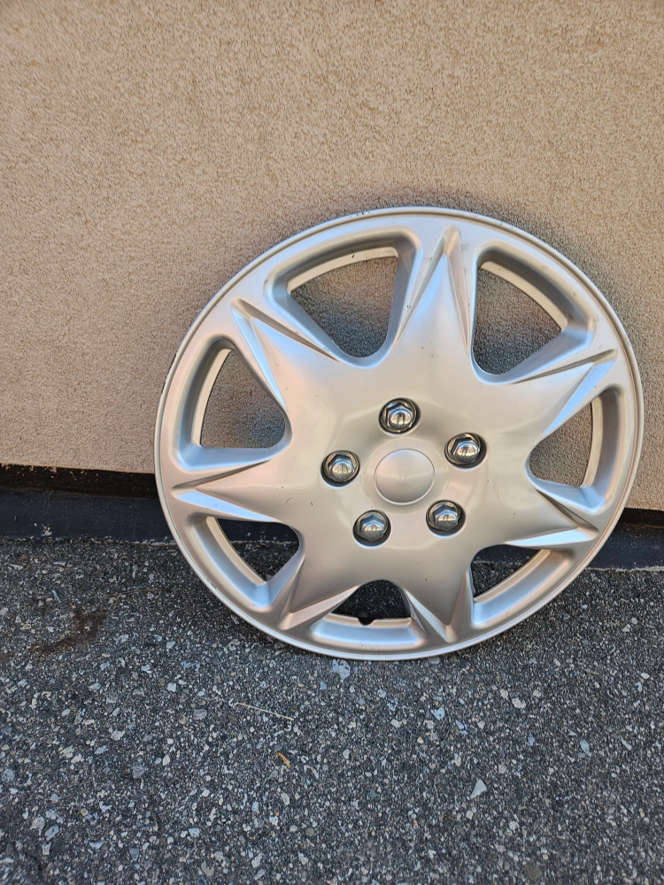 Selling a silver hubcap. It measures about 15 inches in diameter. It's in good condition and ready to be used!