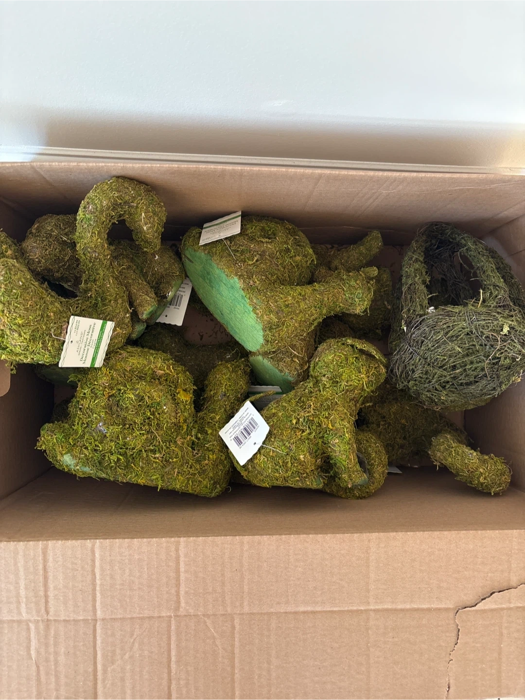 Selling a set of moss animal topiaries! Includes a dog, snail, swan, shoe, and basket. They're in great condition and would look lovely in your garden or as indoor decor! They are made of moss.