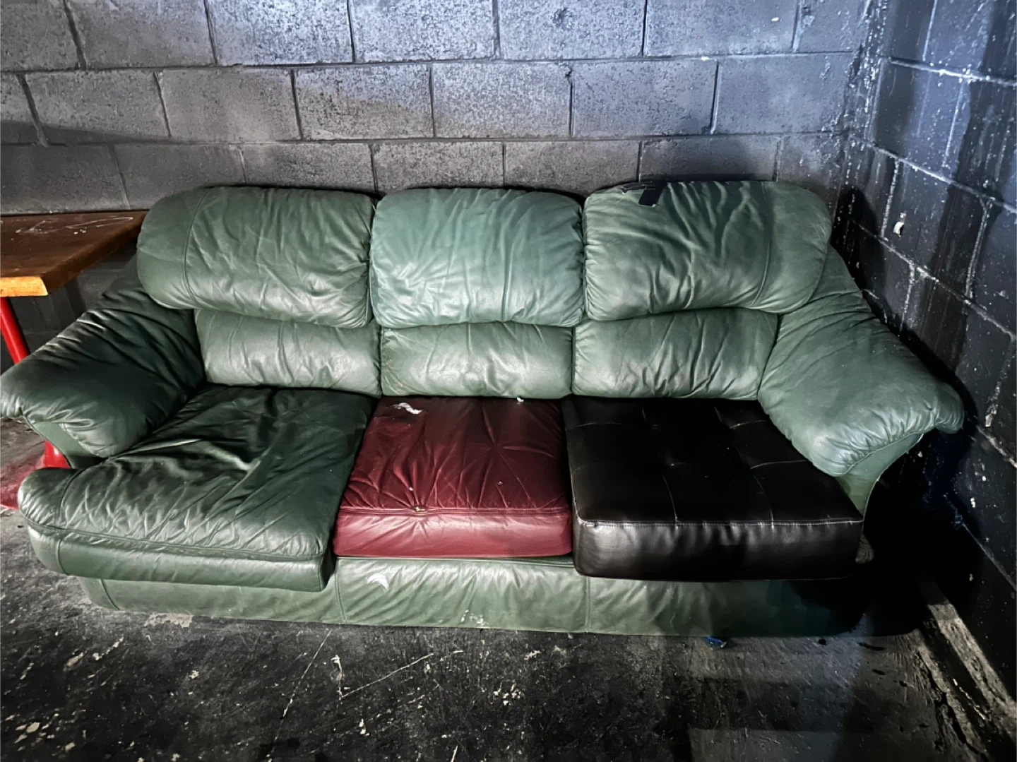 80This is a three-seater leather couch featuring a mix of green, maroon, and black leather cushions, perfect for a den or recreational space. Note that this couch has signs of wear, which adds to its unique character and vintage appeal. Looking to add a splash of colour and comfort to your space? This couch is waiting to be the centrepiece of your room! Don't miss out—if you're reading this, it's still available!