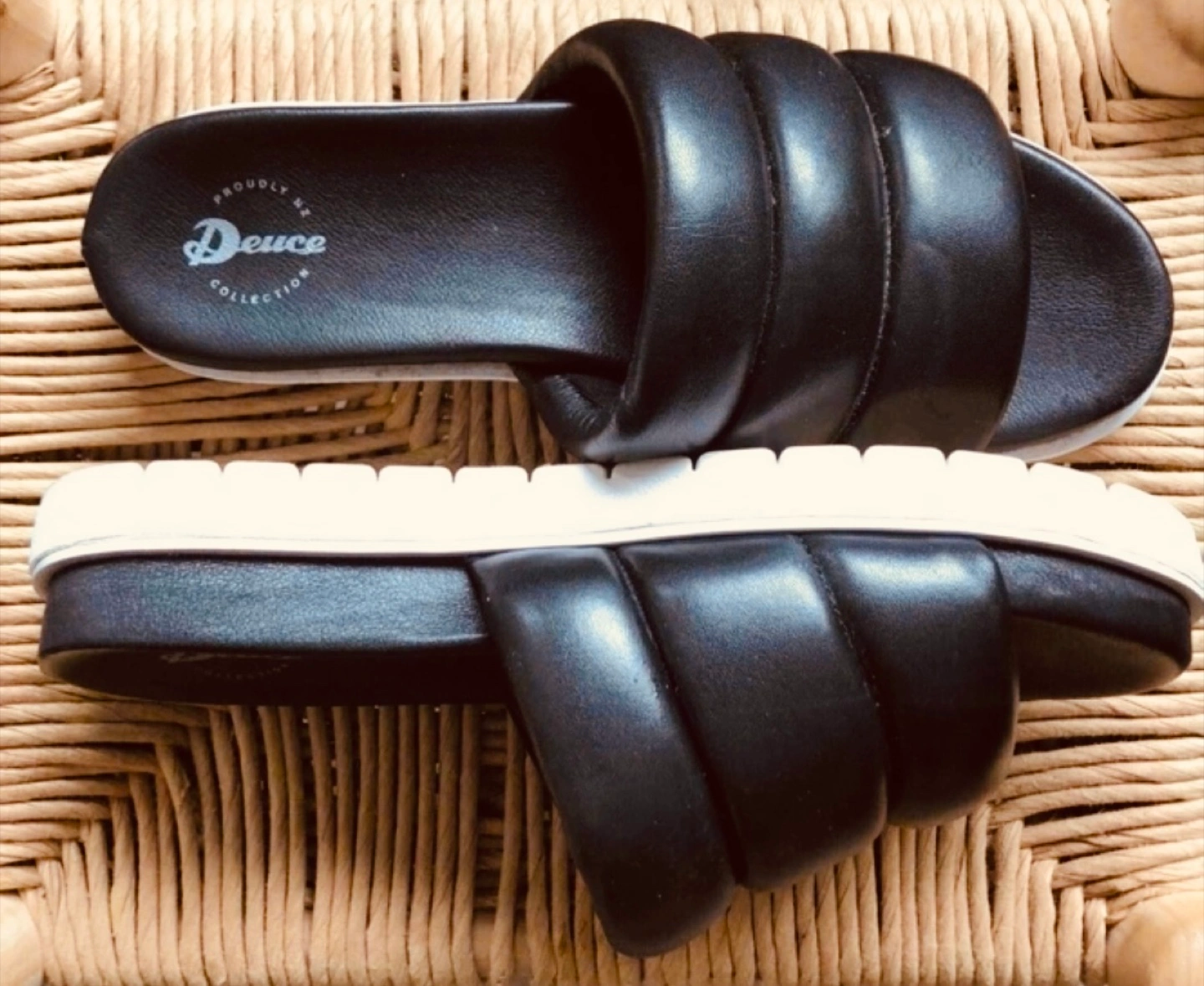 Deuce Collection padded slides in black! They feature a comfortable, puffy design and a durable sole. Great for casual wear or lounging around the house. They're in excellent condition