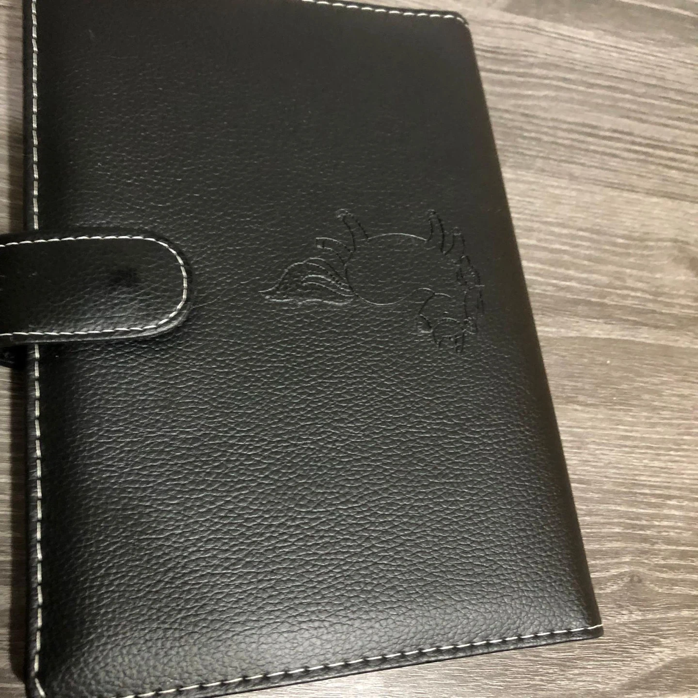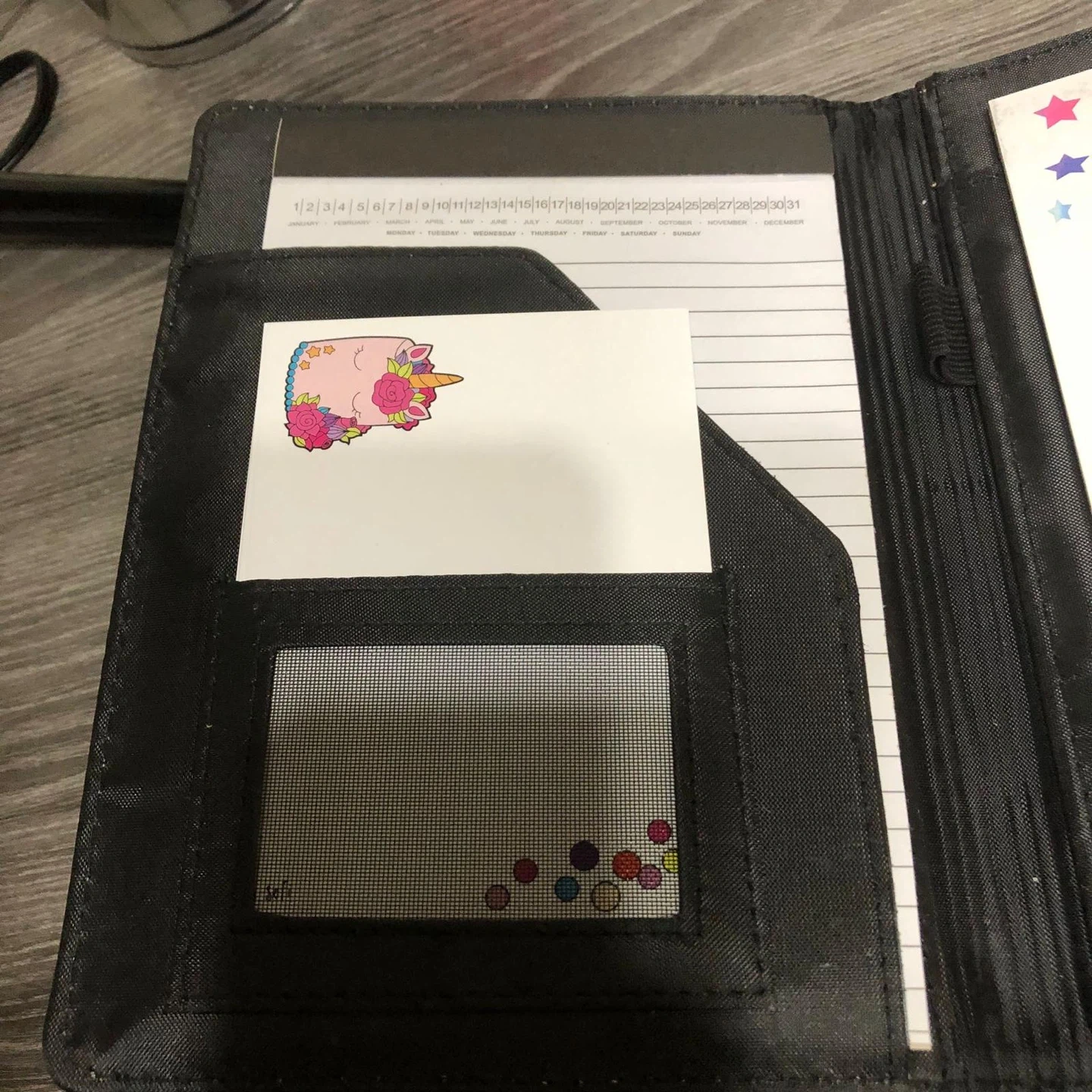 This new small black faux leather notebook features a tab closure and white stitching. It includes a notepad with lined pages and a smaller notepad with a unicorn design that reads, "Don't be a bull, full of shit... Your crap is way magical!". It's perfect for jotting down ideas or making to-do lists.