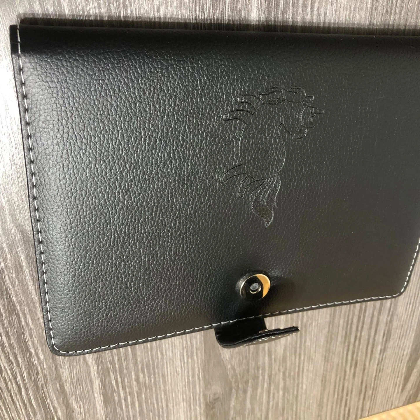 New-Small Black Faux Leather Notebook with Unicorn Design