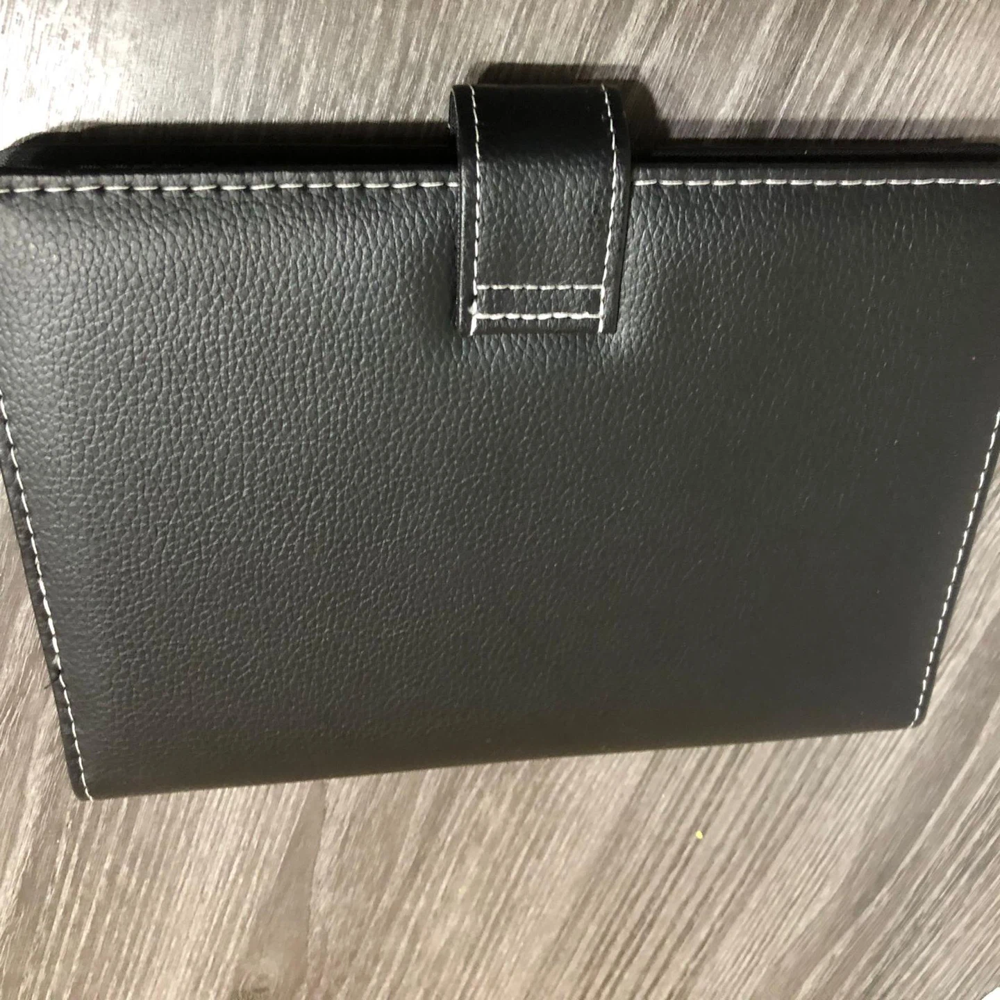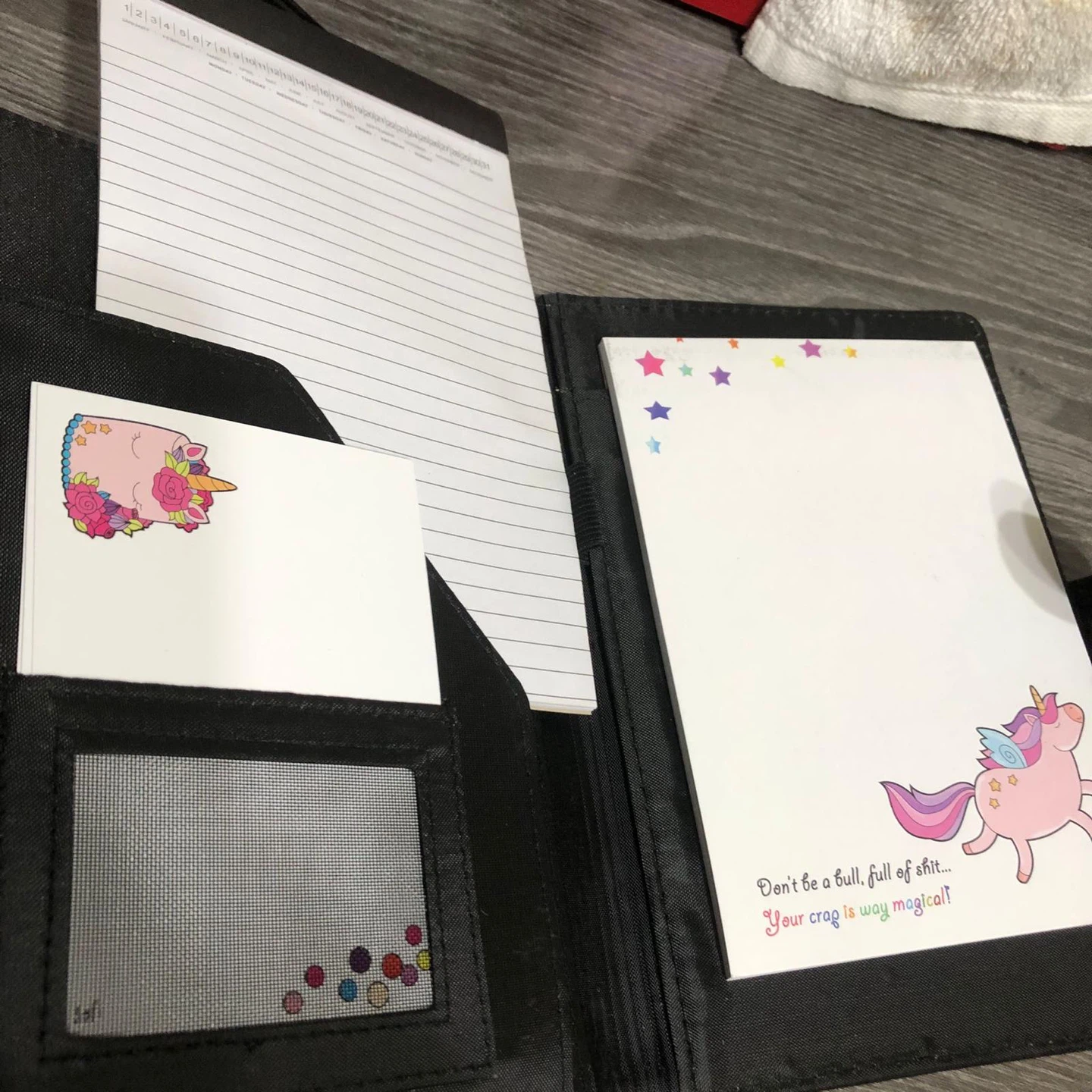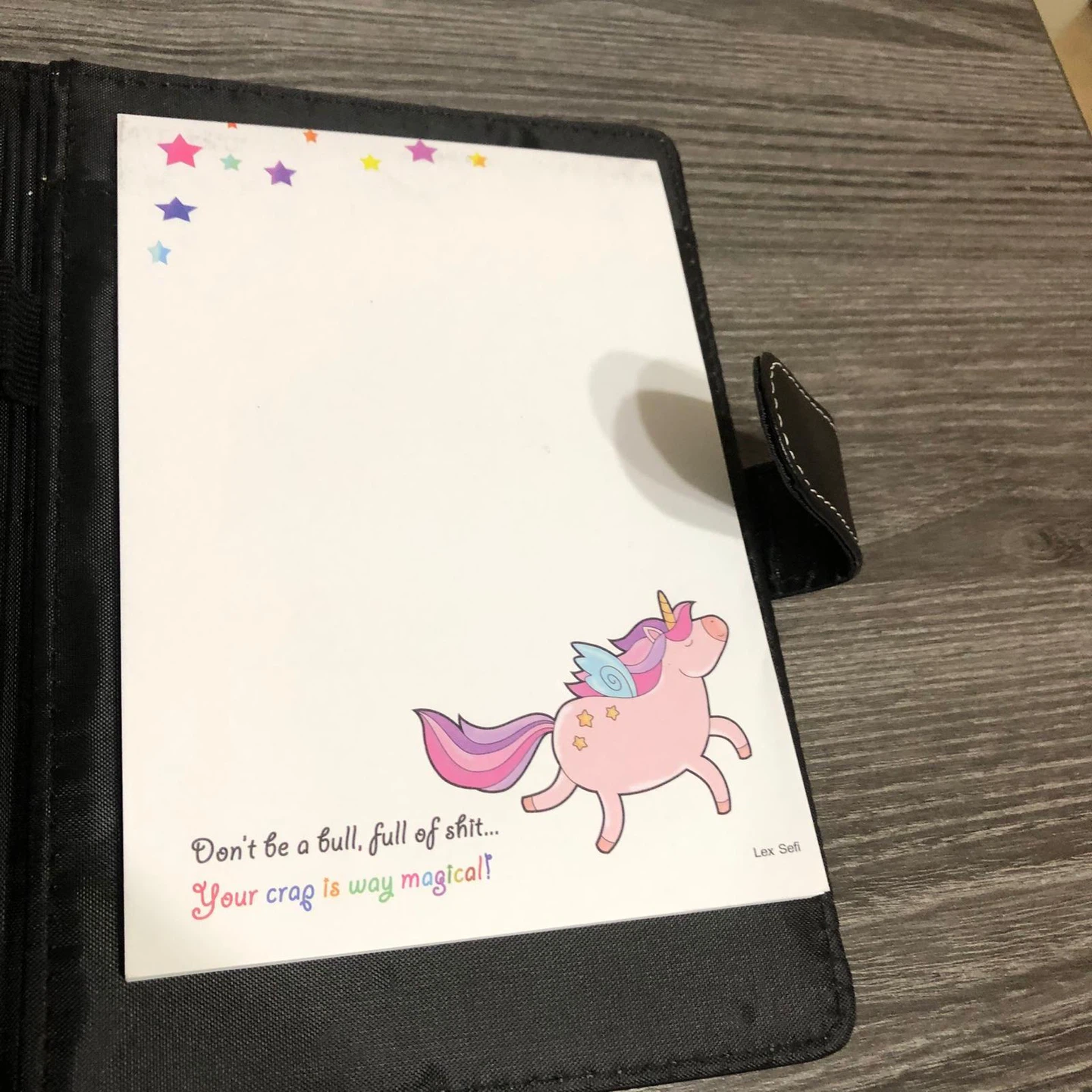 This new small black faux leather notebook features a tab closure and white stitching. It includes a notepad with lined pages and a smaller notepad with a unicorn design that reads, "Don't be a bull, full of shit... Your crap is way magical!". It's perfect for jotting down ideas or making to-do lists.