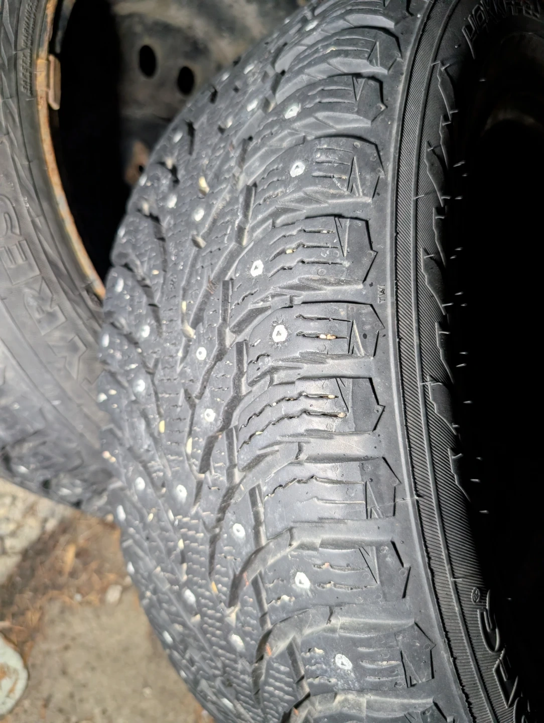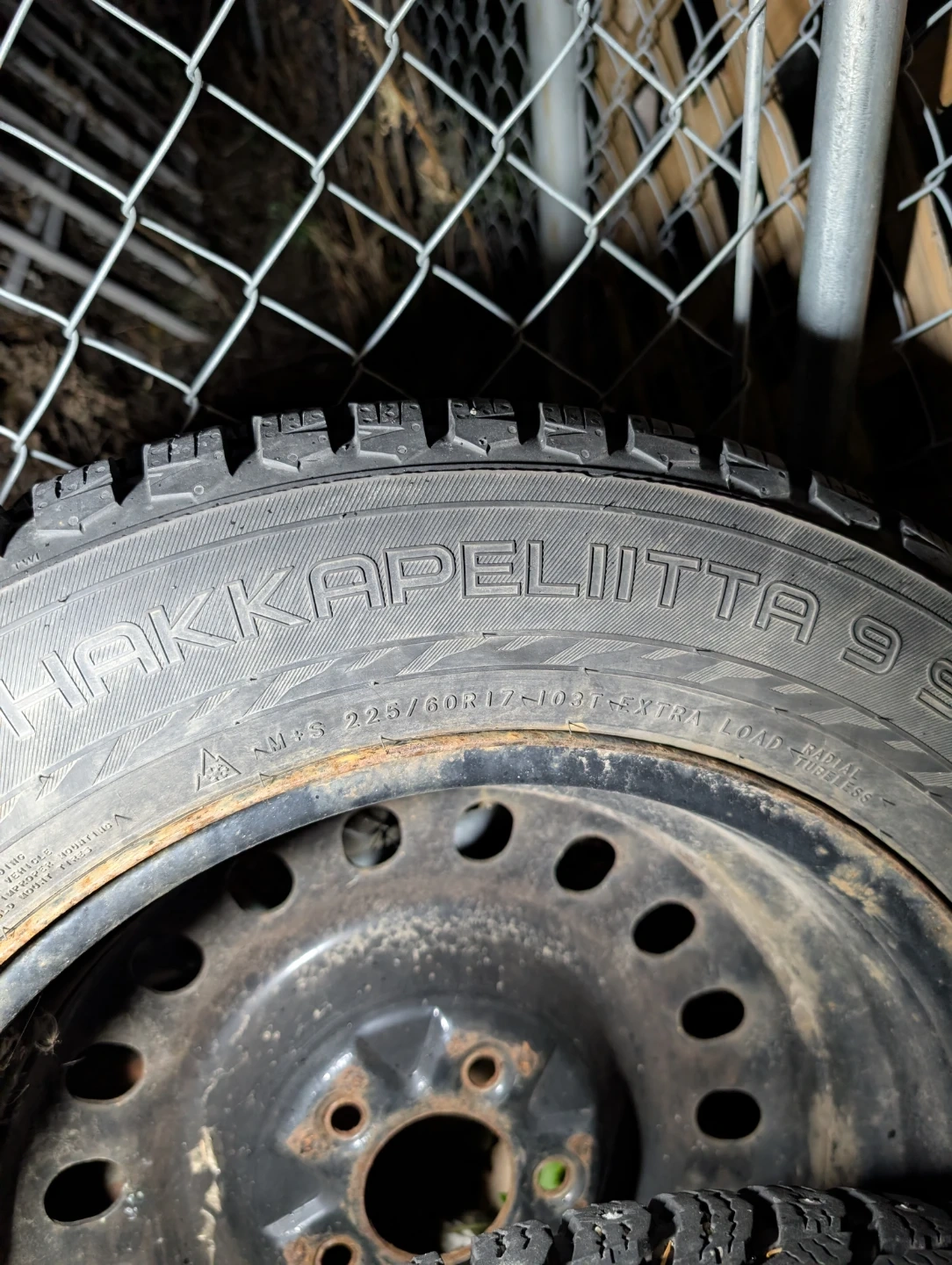 Selling a set of Nokian Hakkapeliitta 9 studded winter tires on steel rims, size 225/60R17. Well used but still has lots of tread and studs are lightly worn. Current rims are from a Chevy uplander