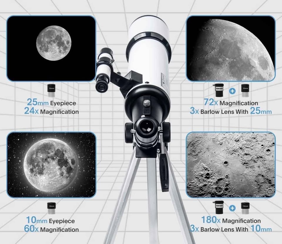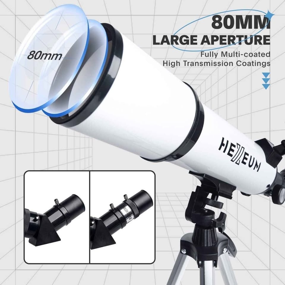 Brand new. 80mm Aperture 600mm - Astronomical Portable Refracting Telescopes Fully Multi-Coated High Transmission Coatings AZ Mount with Tripod Phone Adapter, Wireless Control, Carrying Bag. 80600white.