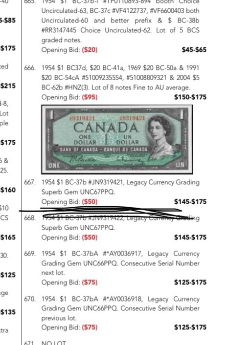 OPENING BID in the 2021 TCNC auction (picture 2) was $50 with an expected turnover of $145-$175 for an UNC (uncirculated) bill. This is a GEM MINT as well as a high serial number!
