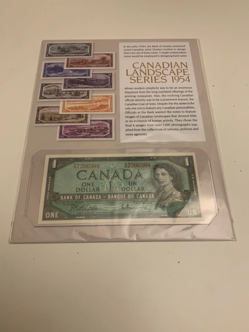 A GEM MINT condition and uncirculated Canadian $1 bill, dated 1954. This bill is inserted in a semi-tough plastic bill holder and slotted into a beautifully designed glicee poster with information describing the process for how this bill came about. Perfect gift for a collector or even a history buff-or just those whose love it!