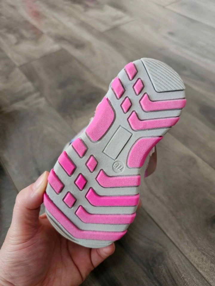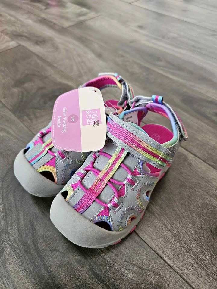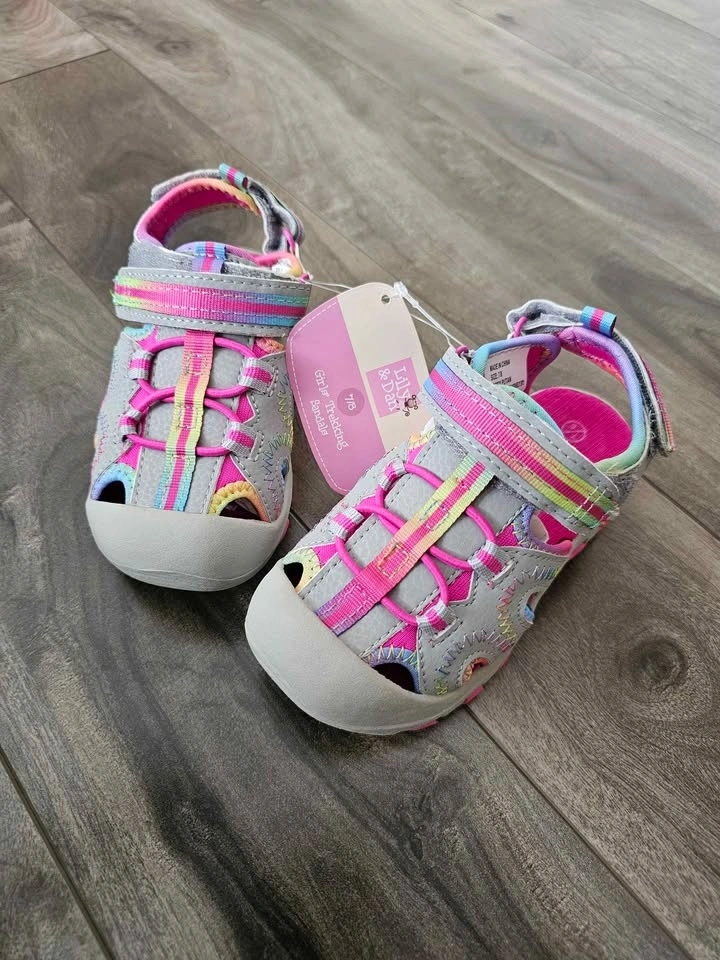 New Lily & Dan girls' trekking sandals. Size 7/8. Features grey, pink, and rainbow stripes. Closed toe design with a velcro strap. Great for outdoor play.
