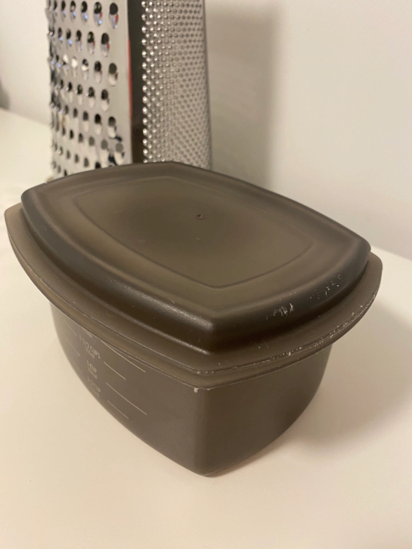 Comes with container and lid. Container holds approximately 3 cups.