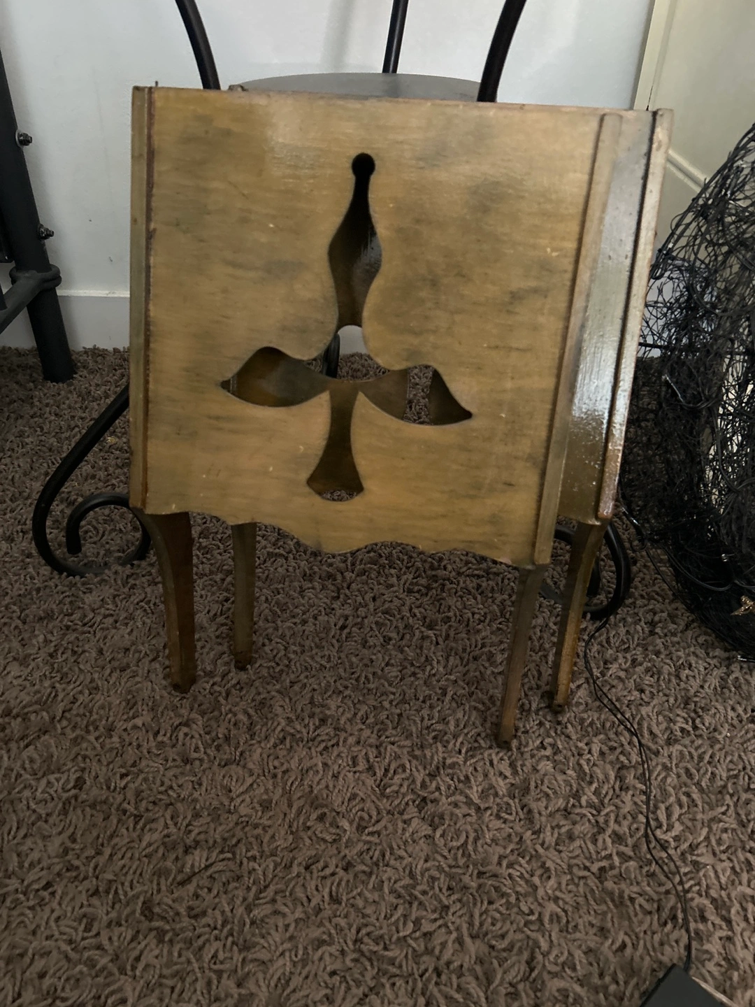 Unique wooden stand. Features decorative cut-out design. Small size. Suitable for small objects or plants.