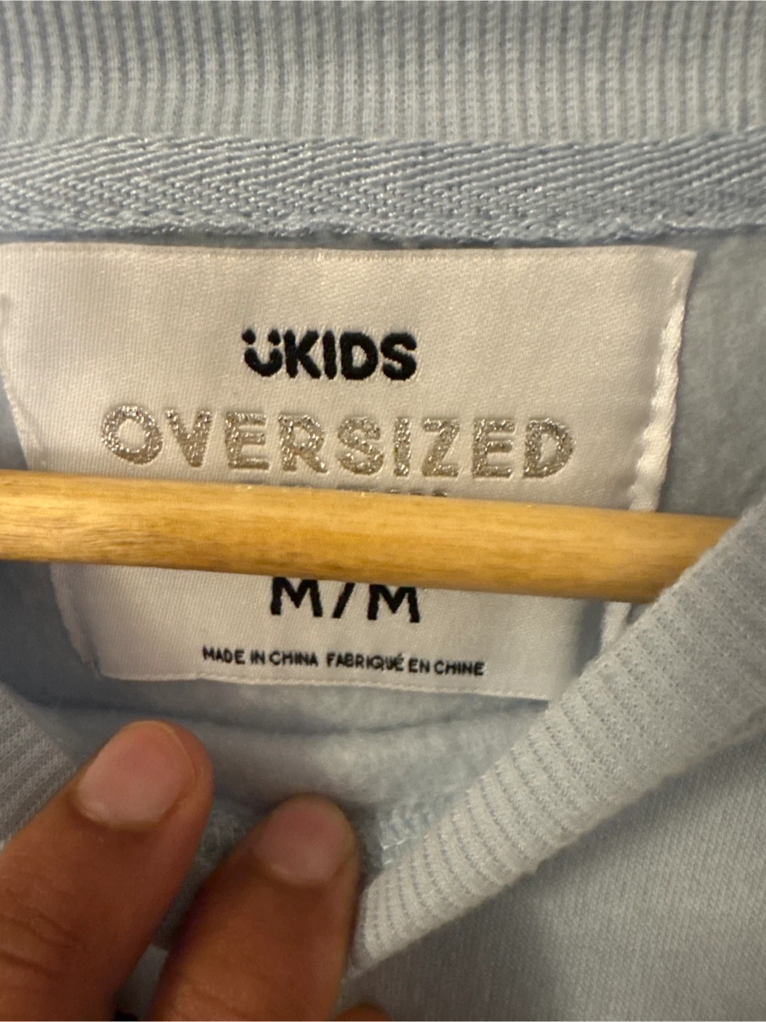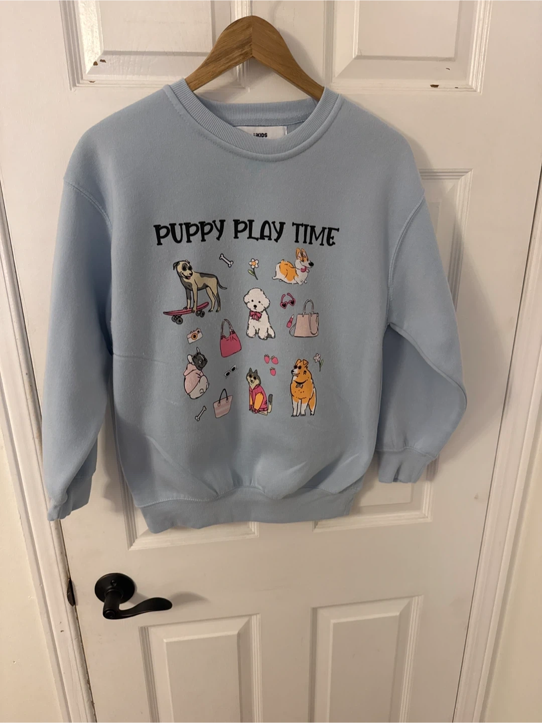 This light blue U Kids sweatshirt features a fun "Puppy Play Time" graphic with various dog breeds. It's an oversized fit and size medium. Made in China.
