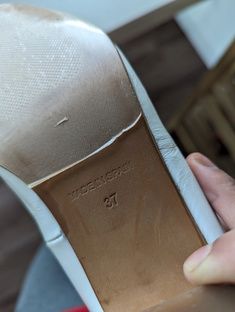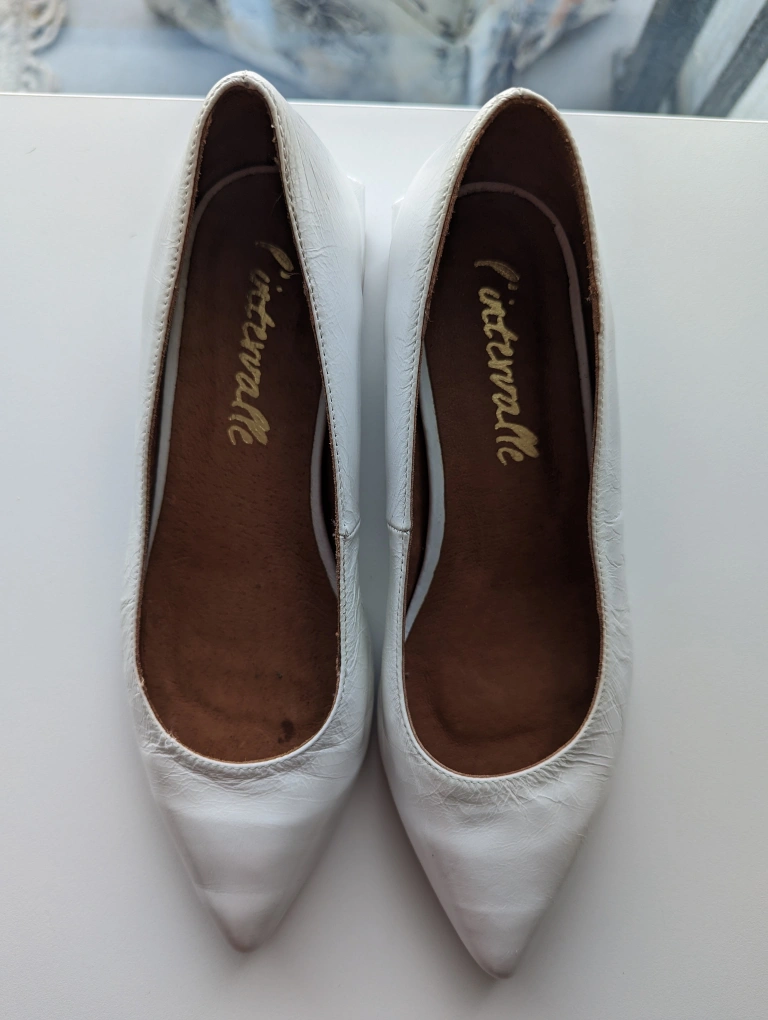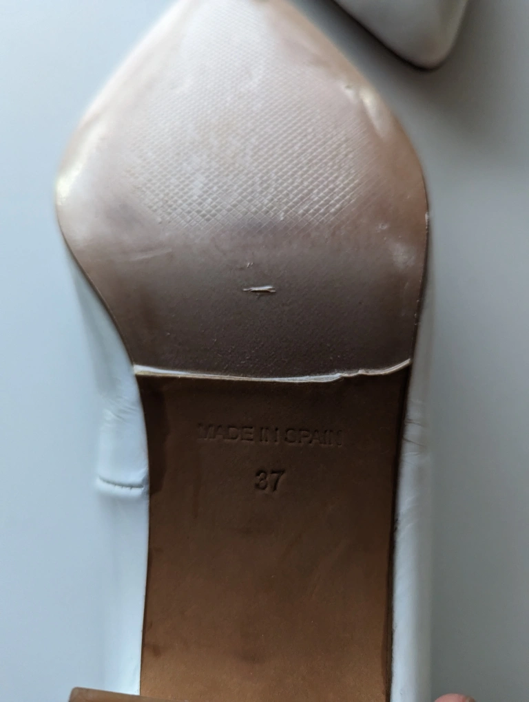 Preloved white shoes in a sheen glossy finish, one inch block heel and slight surface wrinkle which are the brand signatures style. Beautiful and clean soles, barely used and ready for the next loving owner.