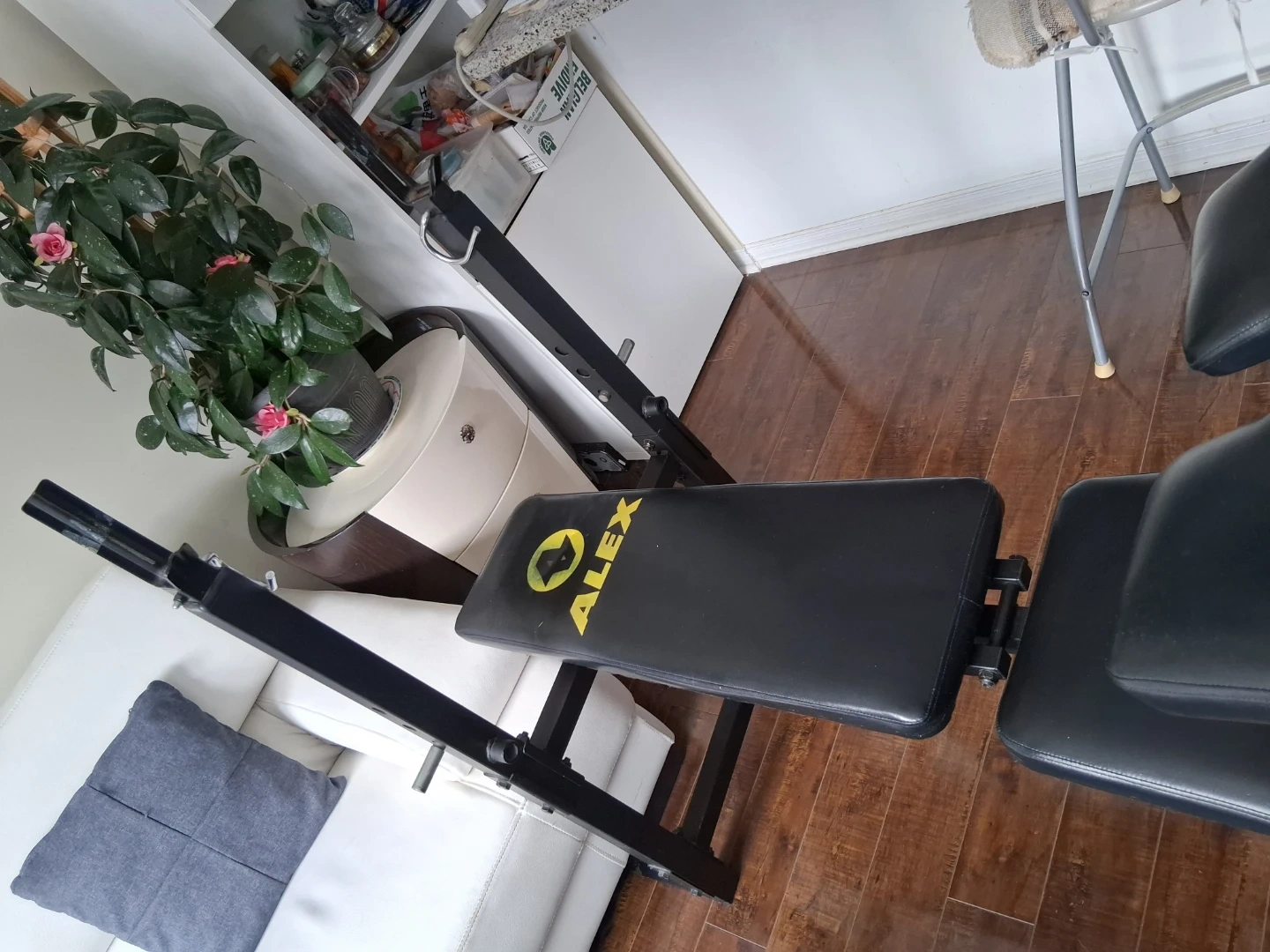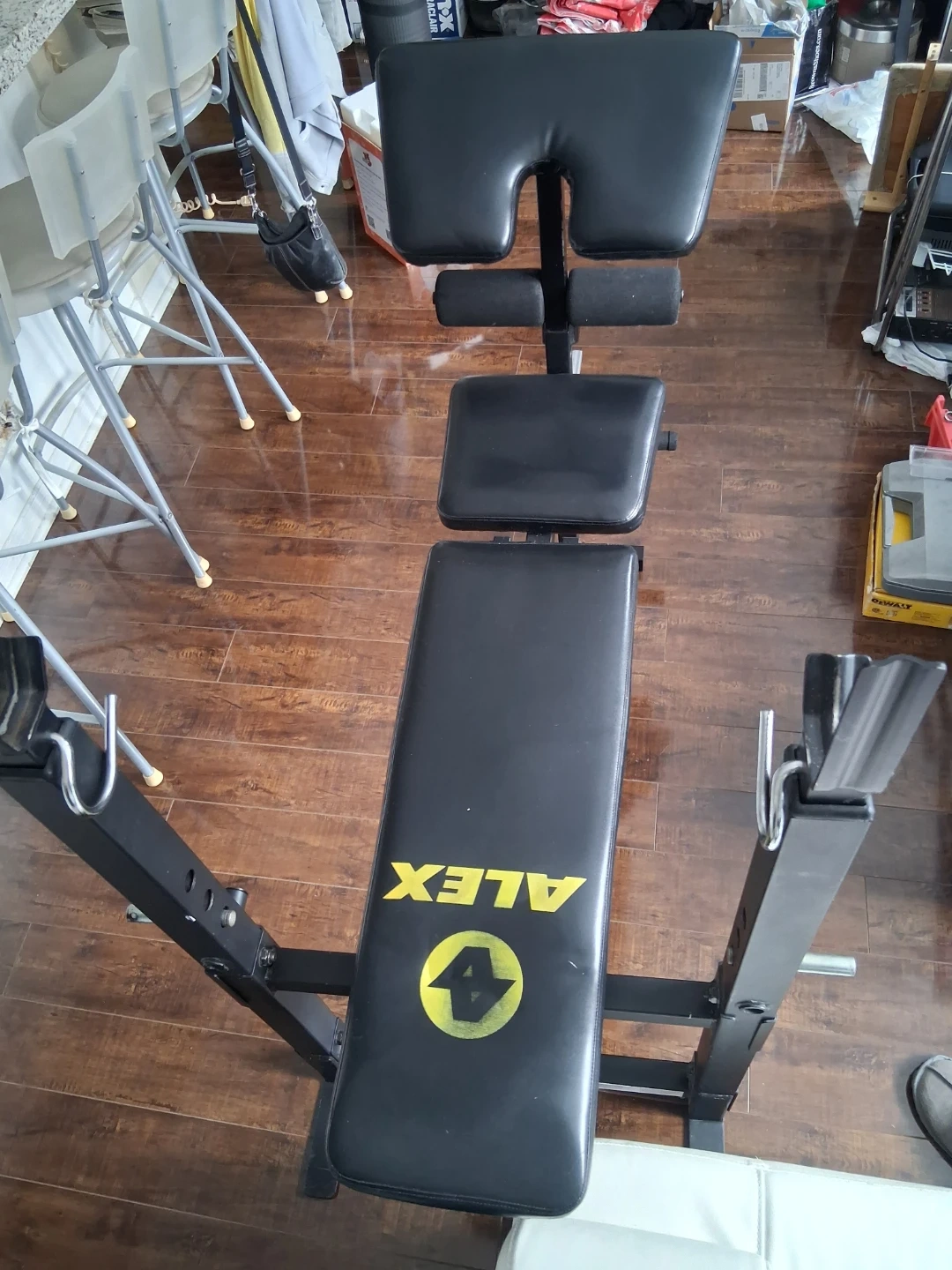 Alex weight bench for your home gym. It's black with yellow branding. Offers adjustable back and leg support. Pu near jane st and rutherford rd vaughan