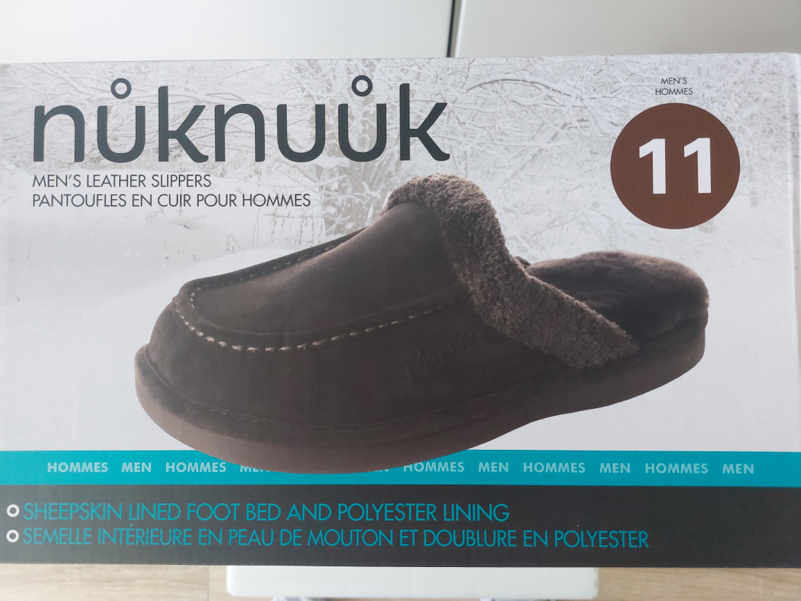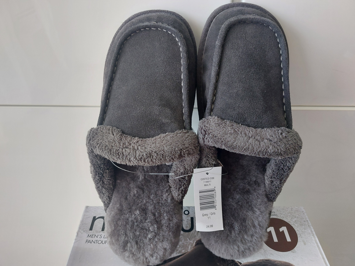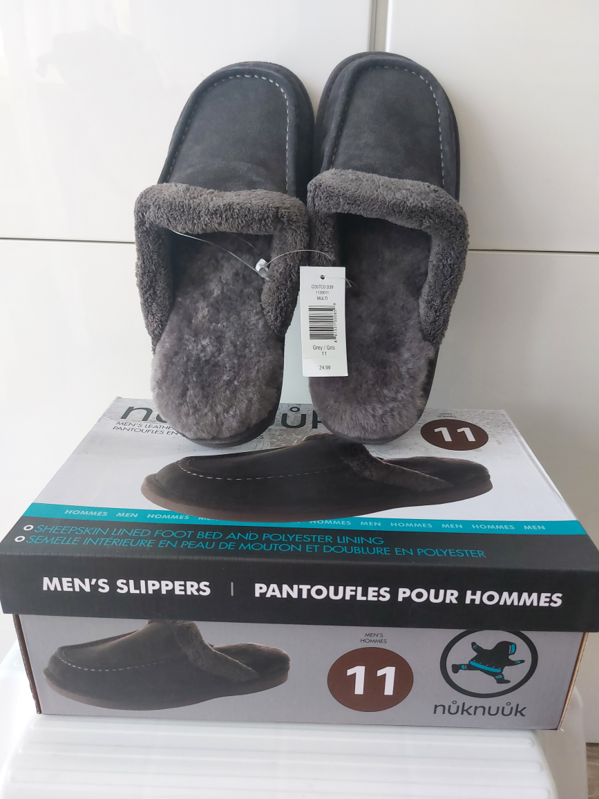 616Brand New In Box Men's leather slippers from Costco Sheepskin lined foot bed and polyester lining Grey in colour, Size 11 Original price $24.99 + tax Pickup at Yonge Street and 16th Ave