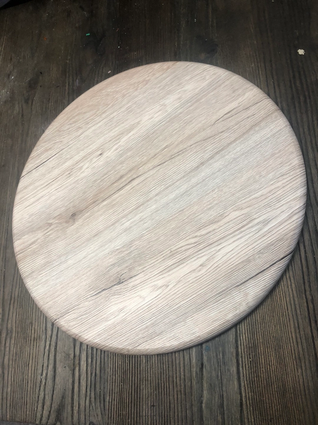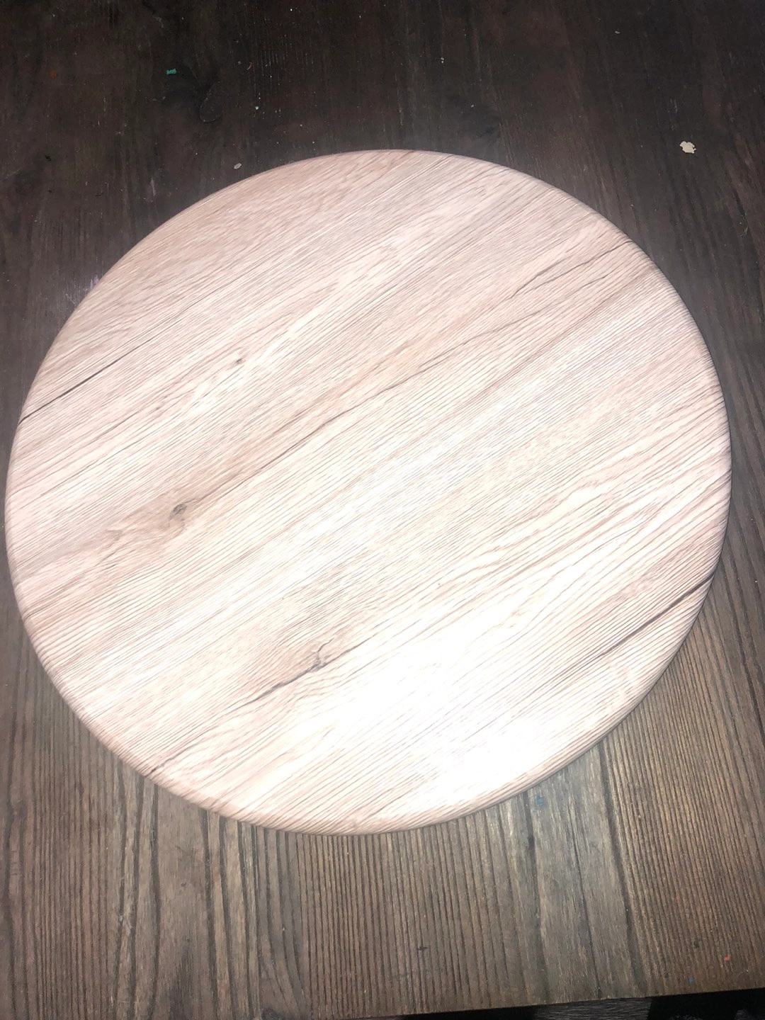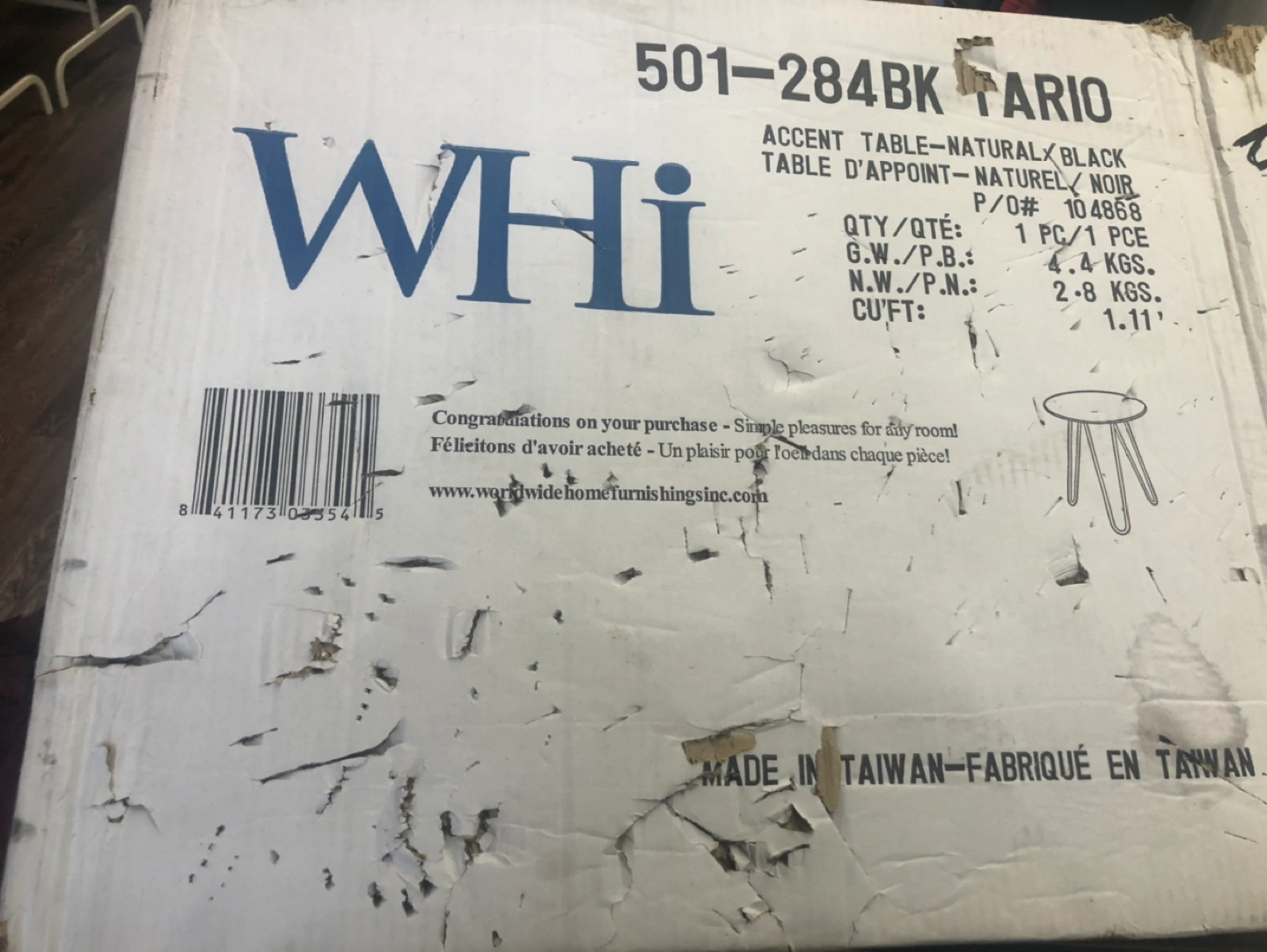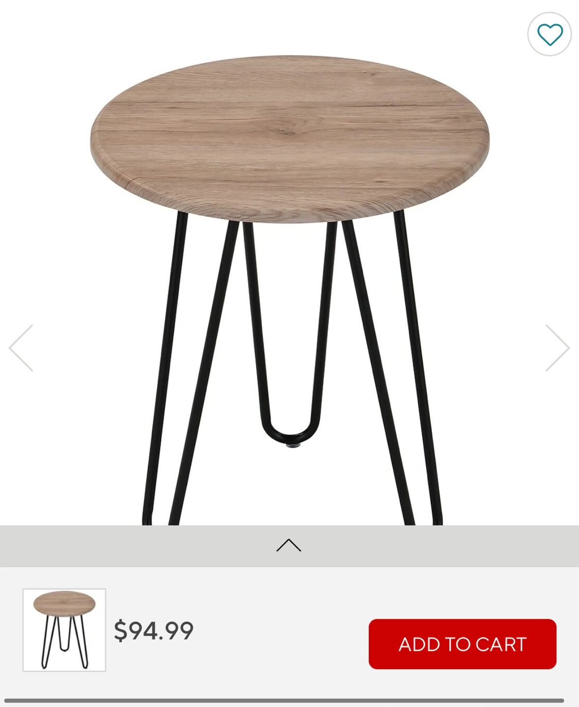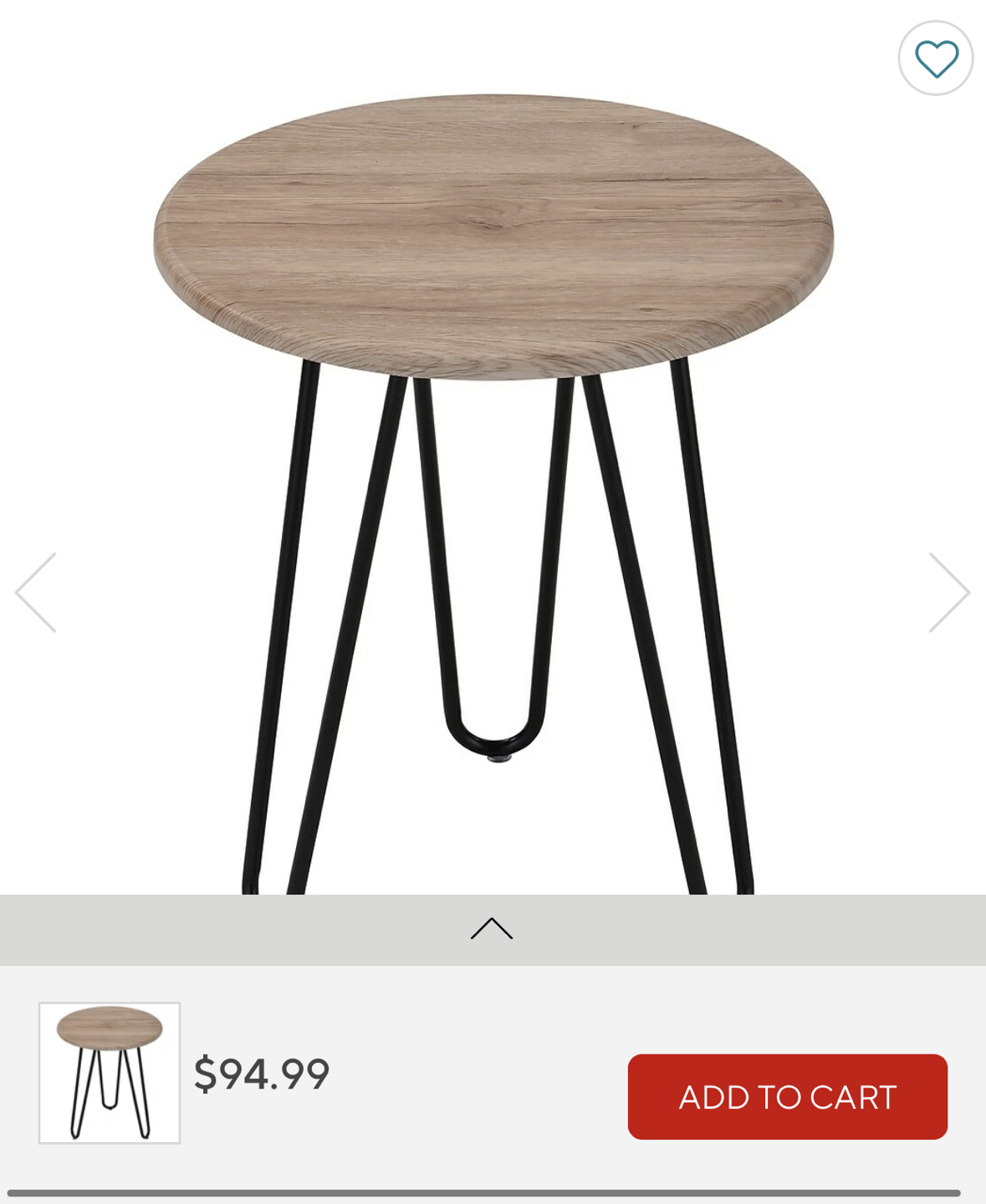 740Side or accent table.Paid $115 Asking for $40 Artisan crafted piece is unique Product is new Box is a little damaged Product Details: This round shaped wooden accent table features faux wood veneer on the table top with a neutral finish, which is sure to bring out the best in your space. It features sturdy, hairpin-shaped metal legs giving it a sleek touch that will make an unforgettable impression in any home. It is suitable for any living room, bedroom, hallway or powder room. Natural faux wood/black metal Sturdy, hairpin-shaped metal legs Faux wood veneer on table top with a natural washed oak finish Legs with a painted black finish Overall dimensions 17.75" Dia. x 19.75"H Assembly Required