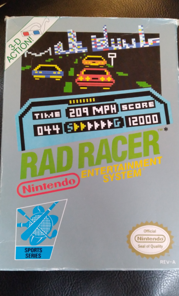 NINTENDO NES GAME CARTRIDGE - RAD RACER - COMPLETE WITH BOX, GAME CARTRIDGE, GAME SLEEVE & INSTRUCTION MANUAL* (* NO STYROFOAM BRICK IN BOX AND NO 3D GLASSES). IN VERY GOOD CONDITION WITH SOME WEAR TO OUTER BOX. TESTED TO BE WORKING ON AN ORIGINAL NINTENDO NES TOP-LOADER CONSOLE.