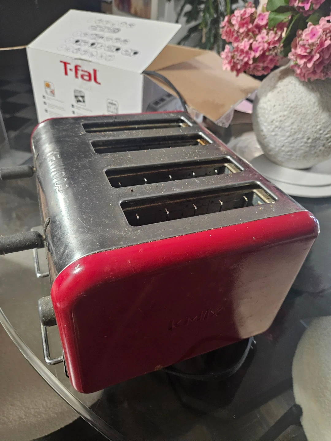A red Kenwood 4-slice toaster. It's in good working condition. Offers variable browning control for your toast preferences. All 4 brunette worker however only on one side each