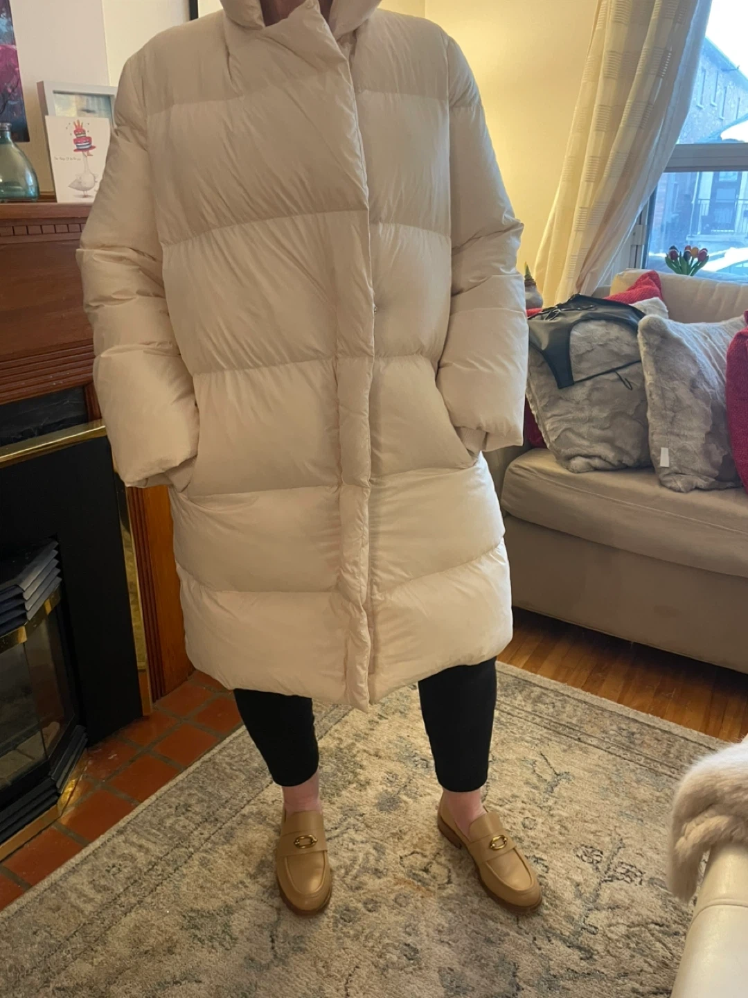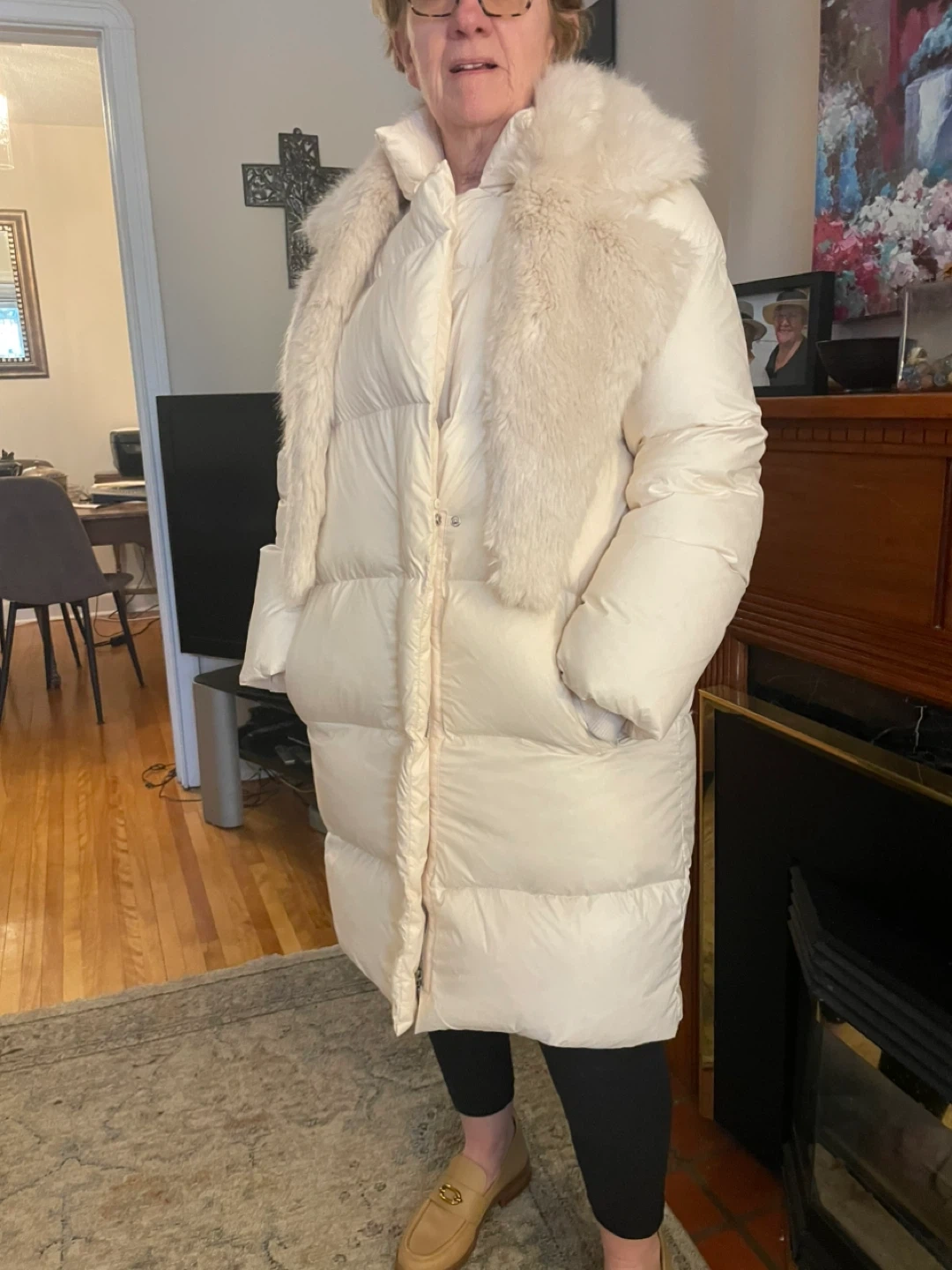Cream coloured long puffer coat. Features a removable faux fur collar and a zip-up front. Pockets on the sides. It's a stylish and warm outerwear option. So warm and elegant!