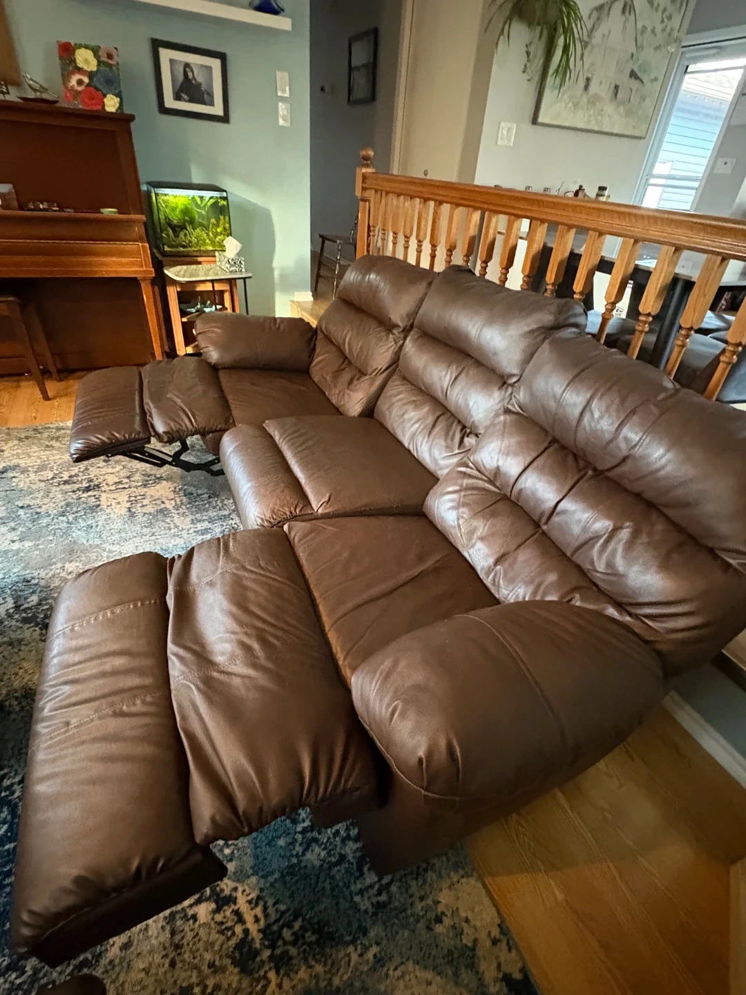 Leather reclining sofa for sale. Chocolate brown in color. Very comfortable if you want to cuddle up to watch your favorite show or scary movie. Also great for that afternoon nap. Some wear and tear on the head and arm rests. Plastic feet on bottom are replaced with wooden ones. Must sell. Pickup only. Call or message me if interested.