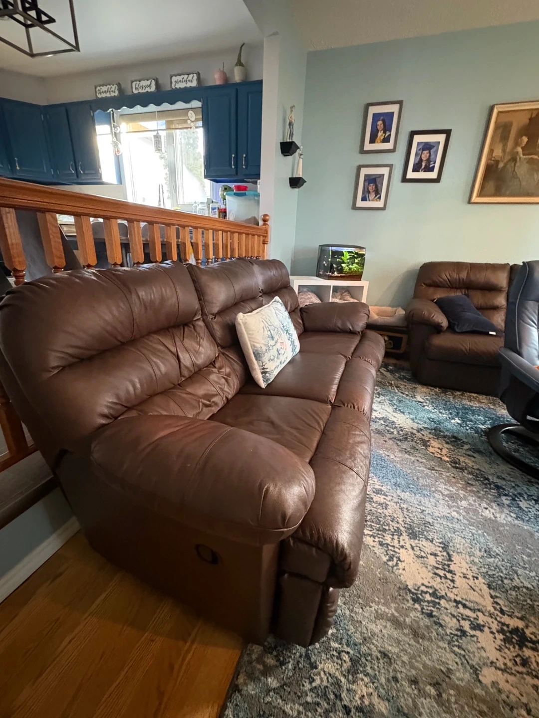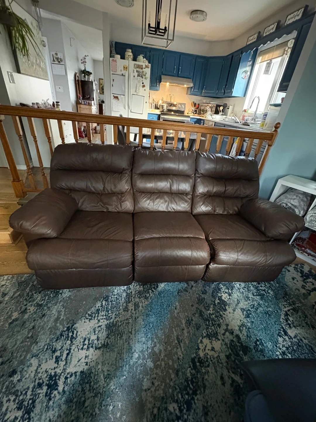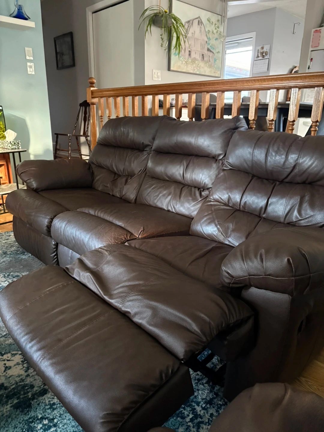 Leather reclining sofa for sale. Chocolate brown in color. Very comfortable if you want to cuddle up to watch your favorite show or scary movie. Also great for that afternoon nap. Some wear and tear on the head and arm rests. Plastic feet on bottom are replaced with wooden ones. Must sell. Pickup only. Call or message me if interested.