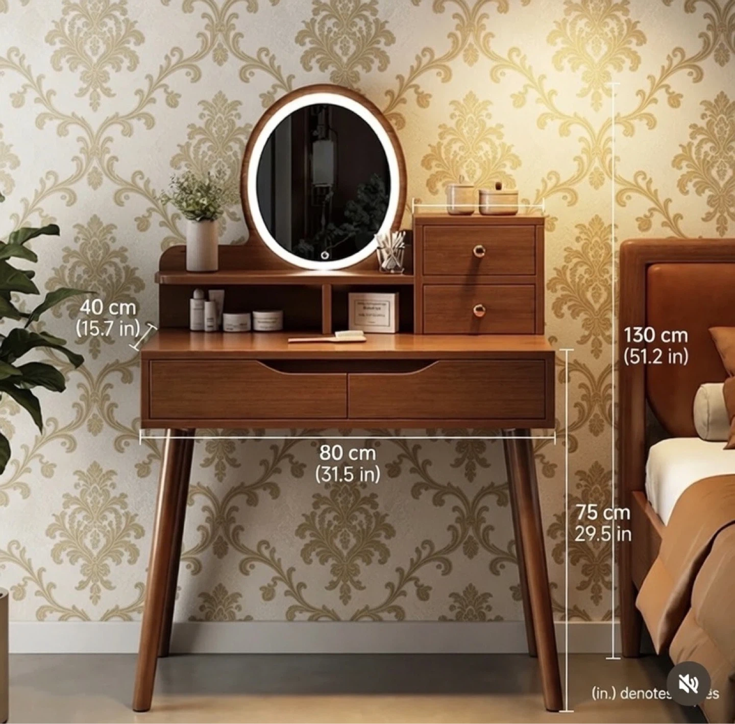 A compact vanity dressing table with an LED-lit mirror and two spacious drawers. It measures 80 cm (31.5 in) wide and 75 cm (29.5 in) high to the tabletop. Its wooden construction and functional design make it a handy addition to any bedroom.