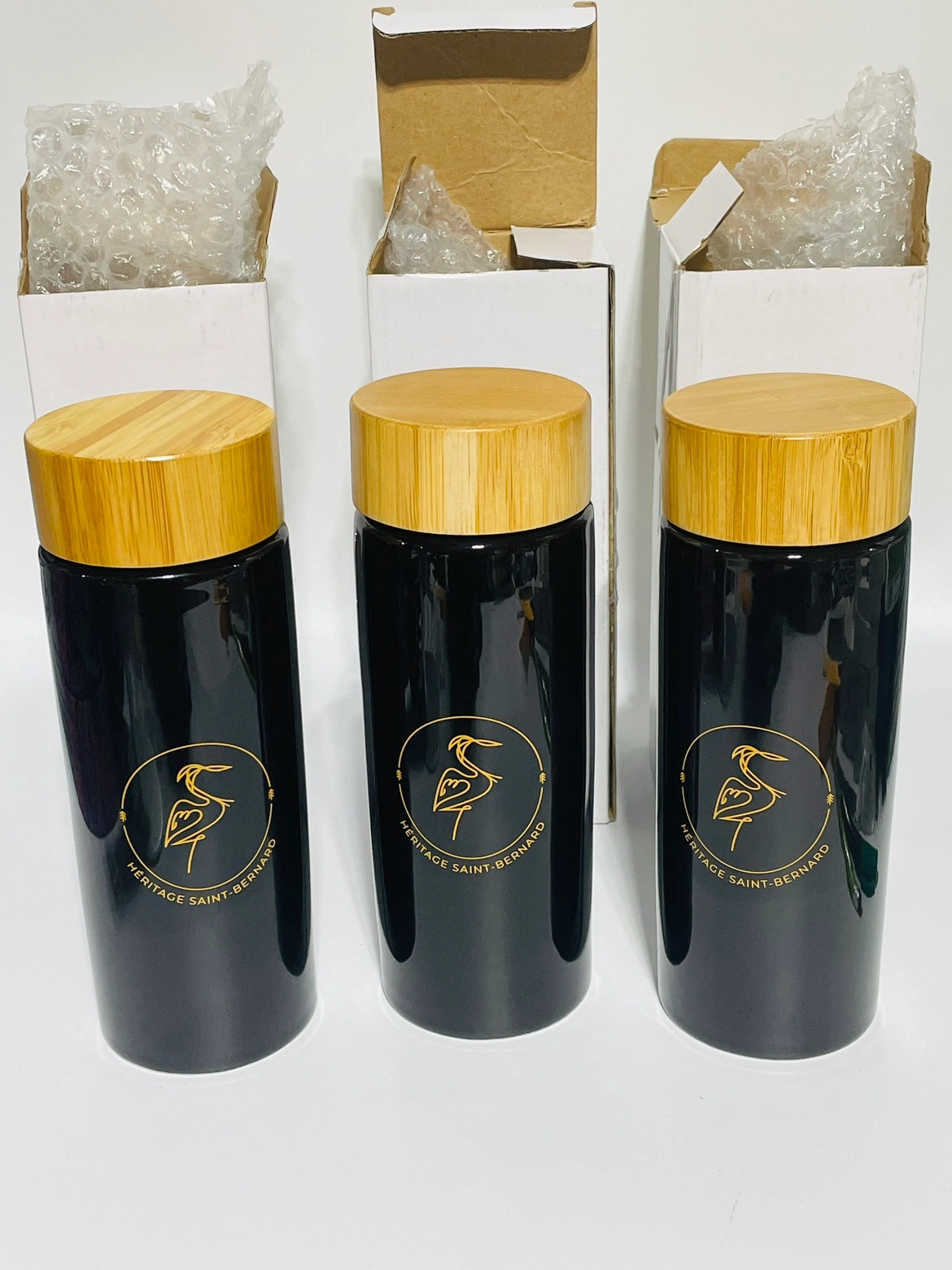 These are ceramic tumblers with bamboo lid. Has Heritage Saint-Bernard logo on side.