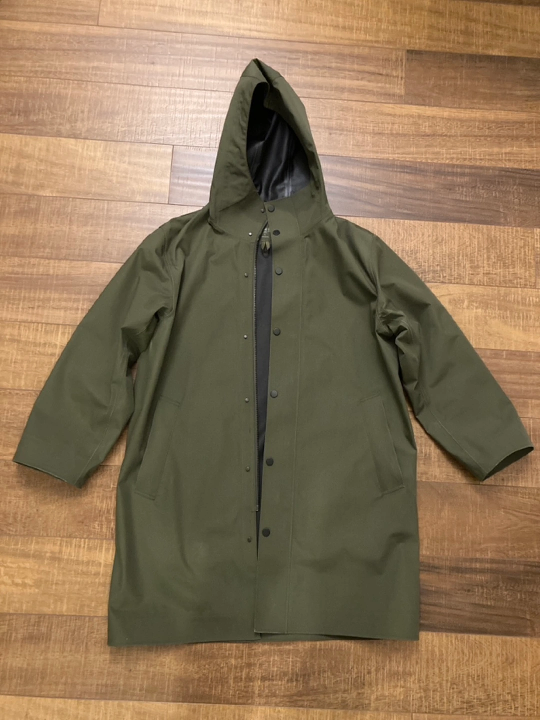 Olive green hooded coat. Long sleeves. Water repellent, windproof, and breathable. Size Large.