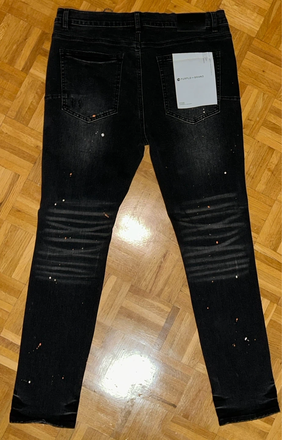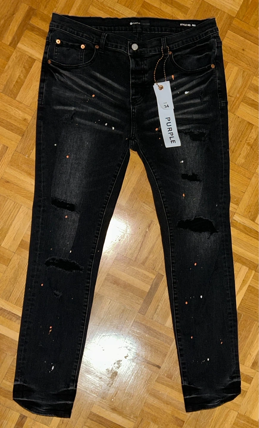 Men's black denim jeans by Purple Brand. These stylish jeans feature a distressed look with paint splatters throughout. Includes original tags.