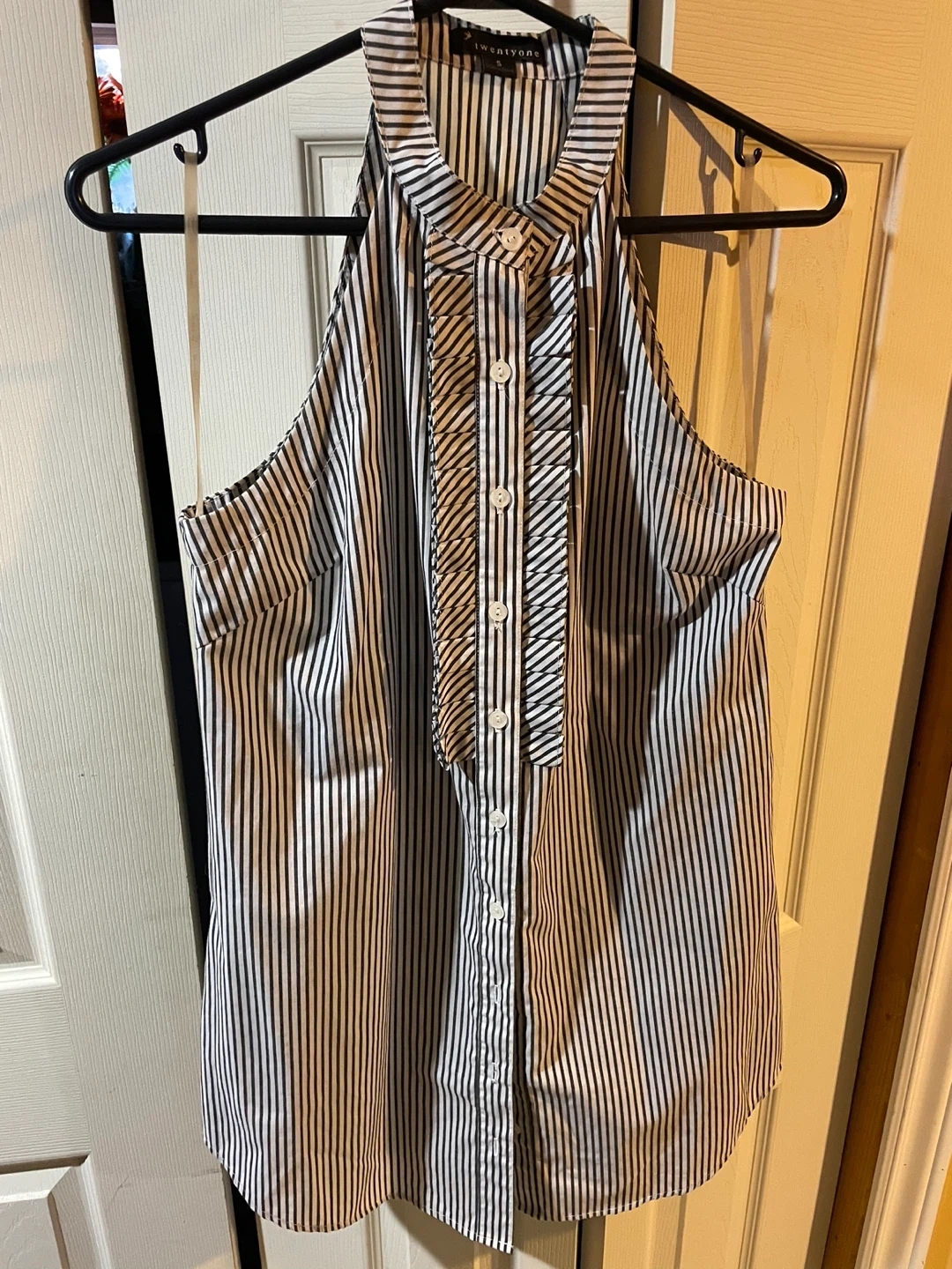 Striped sleeveless blouse from Twenty Two. Features a halter neckline with button-up front and ruffled detailing. Made with a lightweight fabric for comfort. This top is great for dressing up or down!