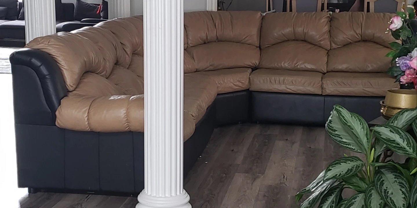 Selling a comfy sectional sofa! It features a tan leather seating area with a black leather base and backing. It's in good condition and ready for a new home!