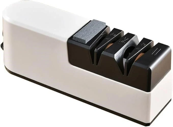 This electric knife grinder features multiple sharpening slots for knives and scissors. It's designed for quick sharpening. Made with durable plastic and sharpening stones.
