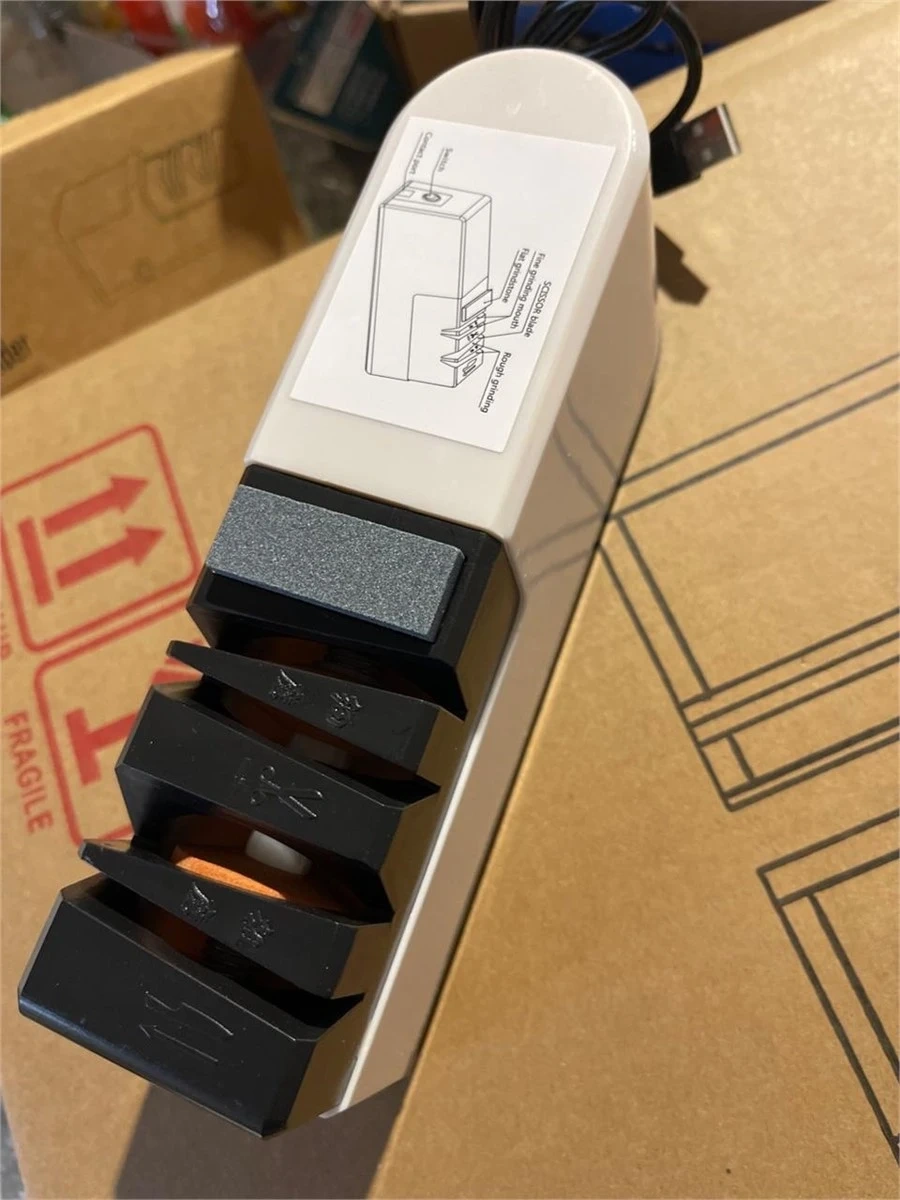 This electric knife grinder features multiple sharpening slots for knives and scissors. It's designed for quick sharpening. Made with durable plastic and sharpening stones.
