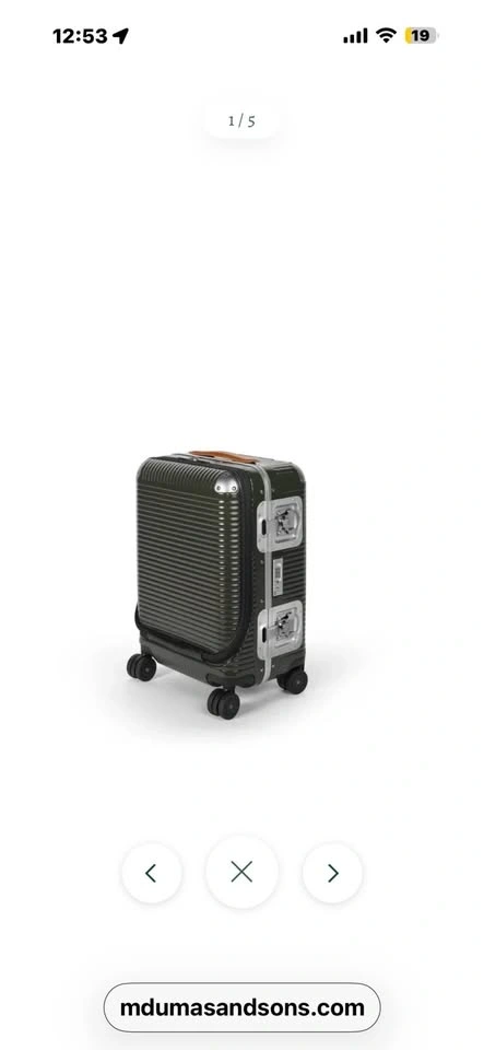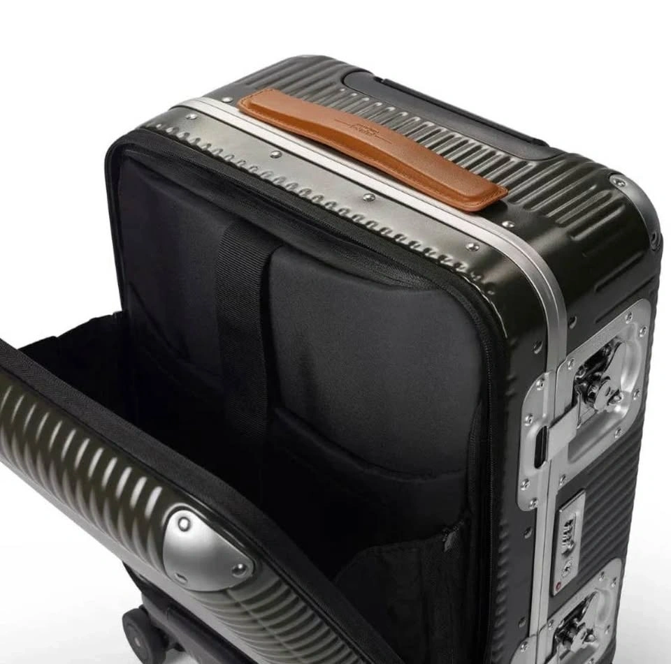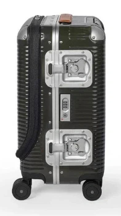 This FPM Milano Bank Light Spinner 53 suitcase is moss green and has never been used. It was originally purchased for over $1400 plus taxes. Designed for every kind of journey, it offers a perfect harmony between strength and practicality. It combines the flexibility and lightness of Makrolon® polycarbonate with luxurious leather details. The robust corners and anodized aluminum hinges add strength and security. The elegant Butterfly Lock completes the exclusive design. Features include a Makrolon® polycarbonate shell, soft Italian leather top handle, non-slip rubber service handle, adjustable telescoping handle, integrated TSA lock, two maxi butterfly locks, fabric tie-down straps with clips, two elastic bands with nickel clips in both shells, and an inside pocket with zipper closure. External composition: 80% polycarbonate, 17% aluminum, 3% cow leather. Internal composition: 99% polyester.