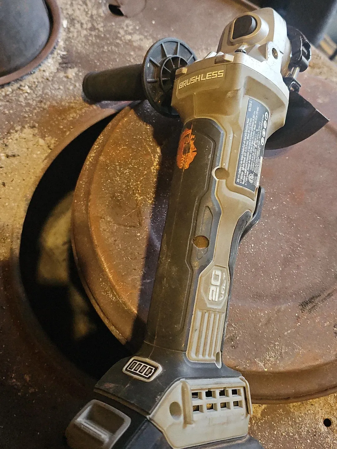 This is a 20V cordless angle grinder with a brushless motor. It features a 20V power system. This tool is handy for various cutting and grinding tasks.