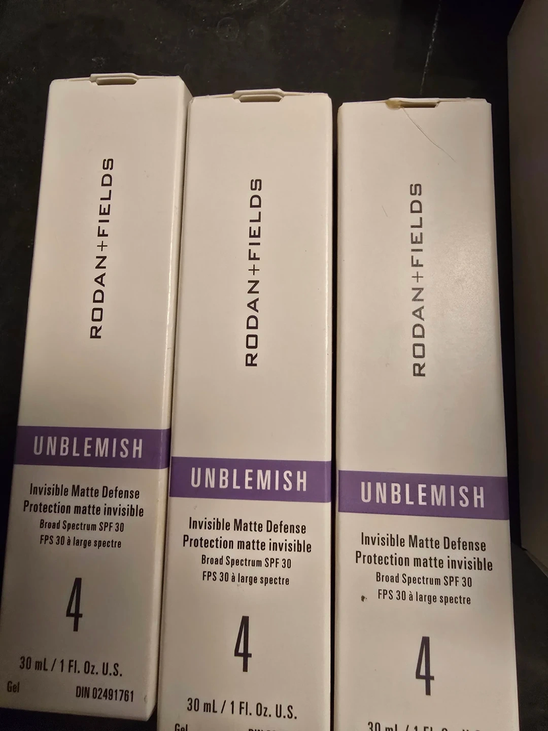 This listing is for three boxes of Rodan+Fields UNBLEMISH Invisible Matte Defense with Broad Spectrum SPF 30. Each box contains 30 mL or 1 Fl. Oz. U.S. of the gel. The formulation offers invisible matte defense and protection. This sunscreen is suitable for daily use. Retail $48 each. I'm selling $15 each.