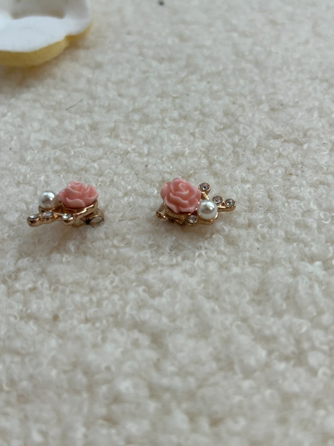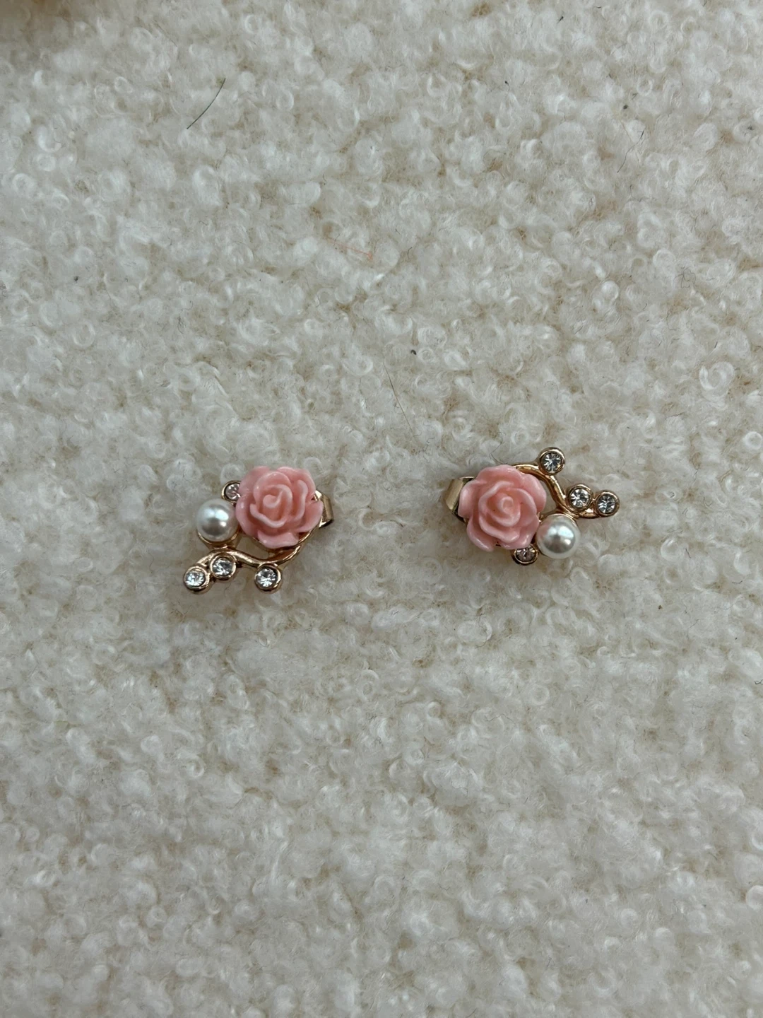 Sweet pair of earrings featuring pink roses and faux pearls. Accented with small rhinestones on a gold-tone branch design. They're perfect for adding a touch of charm to any outfit!