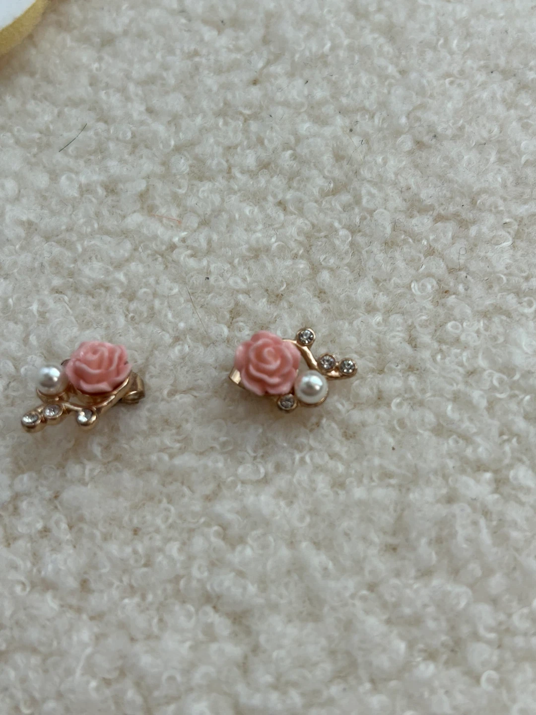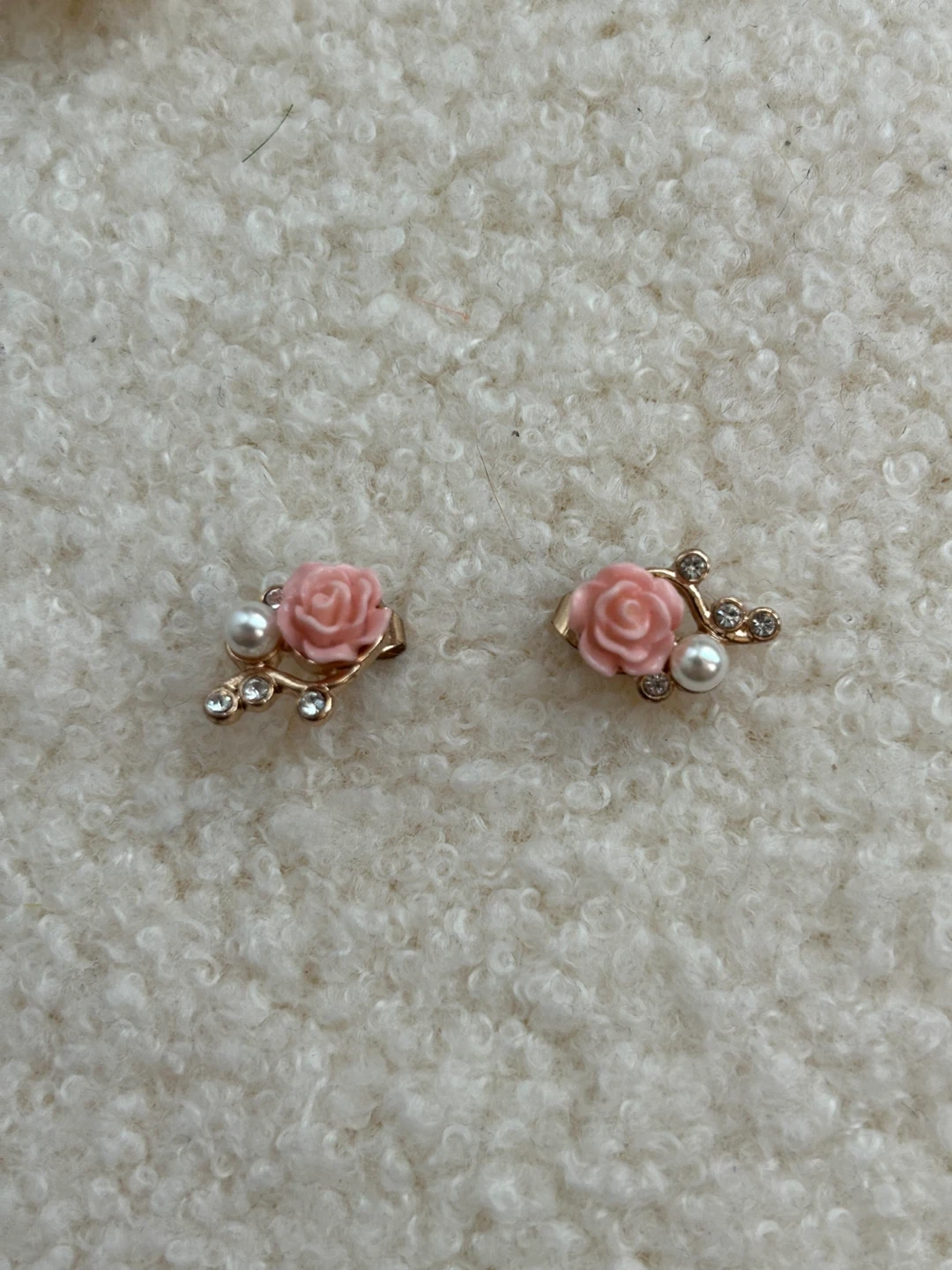 Sweet pair of earrings featuring pink roses and faux pearls. Accented with small rhinestones on a gold-tone branch design. They're perfect for adding a touch of charm to any outfit!