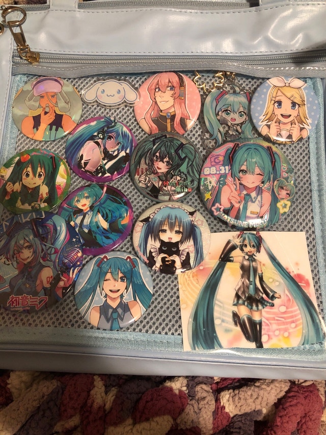 All pins and keychains are included with the Hatsune Miku itabag. If you're interested in purchasing just a few pins or the bag by itself, please send me a message. This item is used but in like-new condition. Cash is accepted, and cashless payment is also an option. Pickup is available curbside.