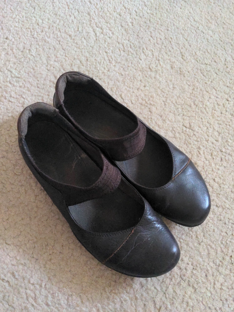 These Hush Puppies ballet flats are a dark brown colour. They feature a comfortable elastic strap across the top. Very durable! Leather up.