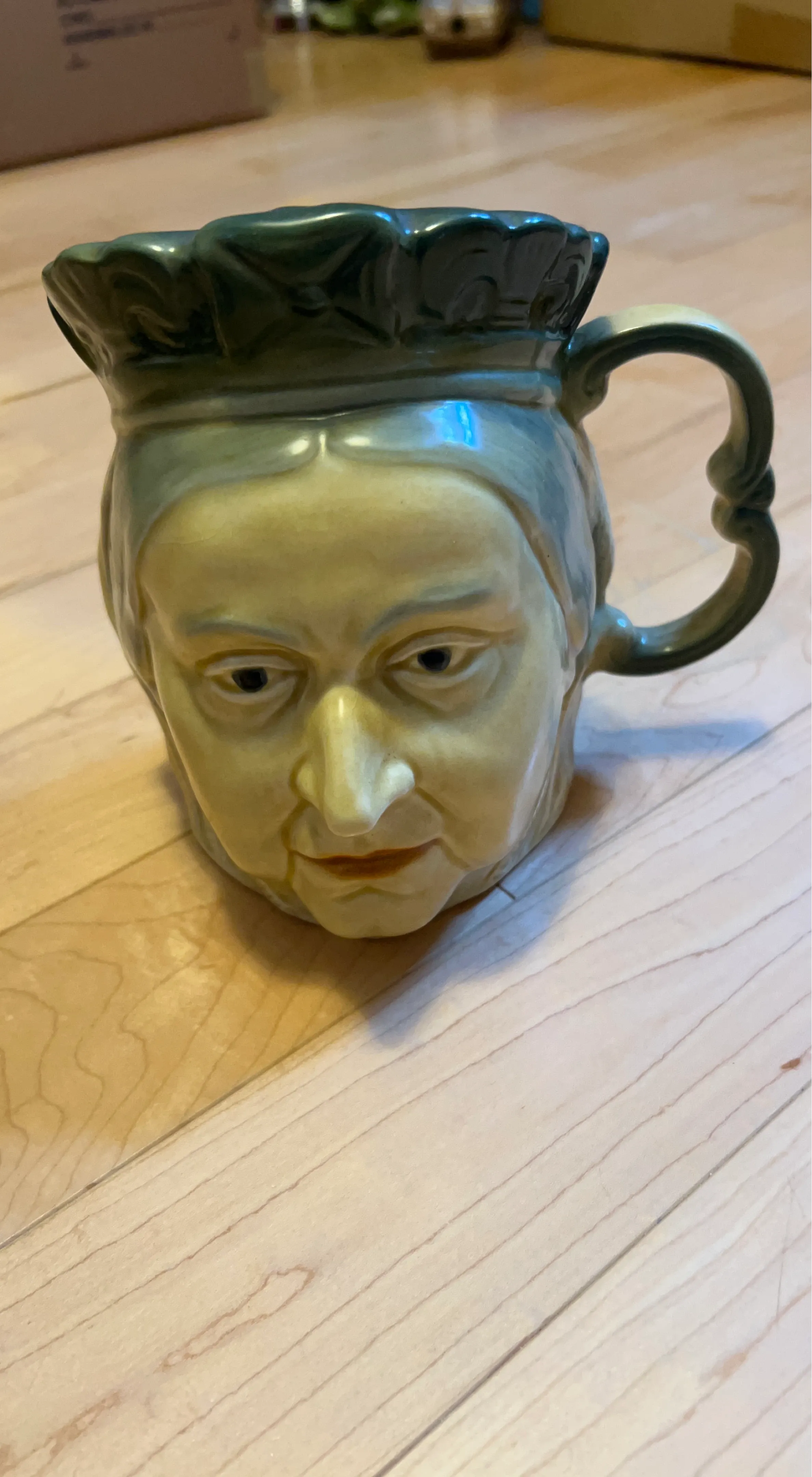 A unique ceramic mug with a sculpted face design. It has a green, crown-like rim and a twisted handle. Perfect for adding a quirky touch to your kitchenware!