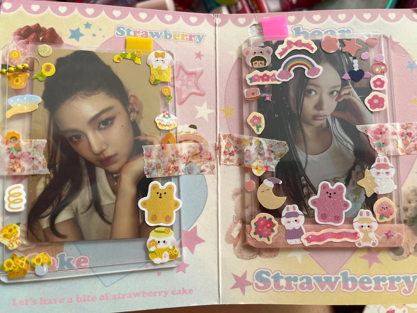 Selling these cute NewJeans photocards! They're decorated with adorable stickers and washi tape. Perfect for any NewJeans fan looking to add some extra flair to their collection!