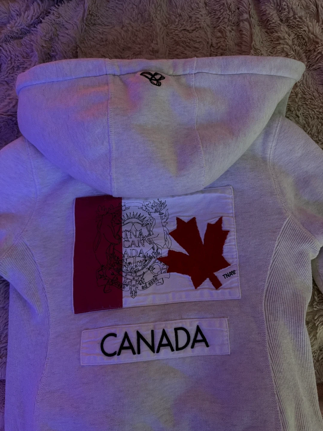 Cozy TNA hoodie in light grey with a warm faux fur lining. Features a Canadian flag patch on the back and "CANADA" text below it. Zipper closure with front pockets. Size is small