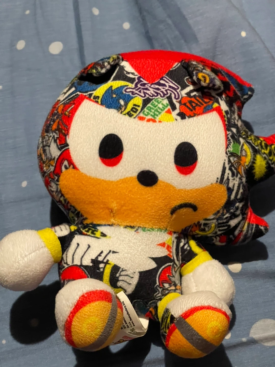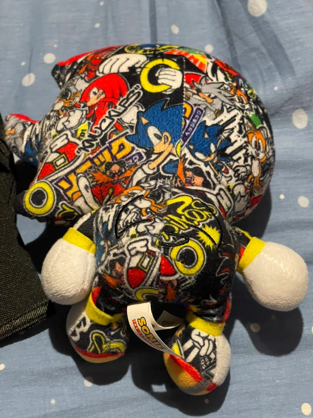 This is a Sonic the Hedgehog plush toy. It's covered in a sticker-bomb style print featuring various Sonic characters and logos. Soft plush material with embroidered details.