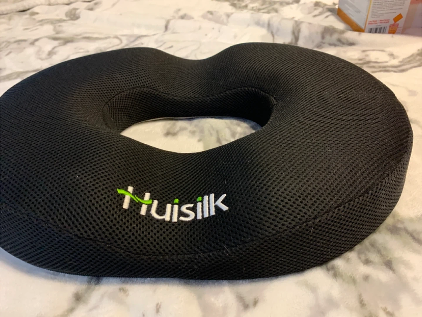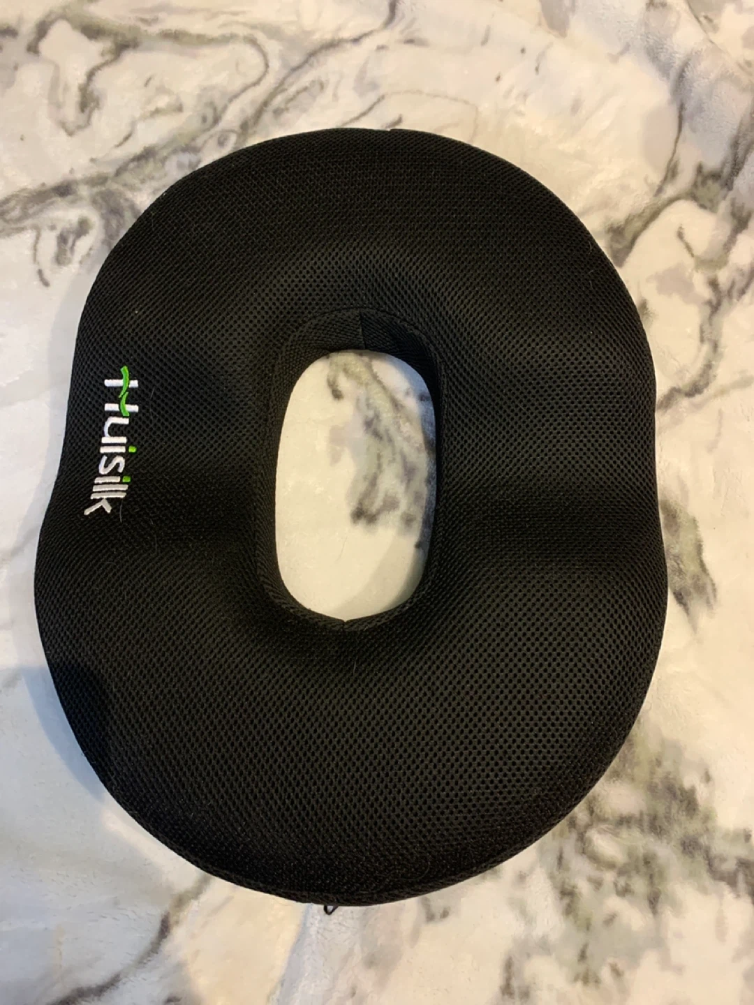 This is a black ring cushion by HUISILK. It's made with a breathable mesh fabric. Provides comfort for extended sitting periods.
